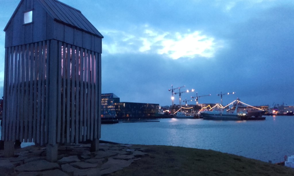 On New Years Eve 2018 Leashia and I decided to investigate before it got dark. The harbour arm walk there was pleasant and it takes you past boutiques and cafes as well as the Grandi Foodhall. You are also near some museums and the Fly over Iceland attraction. As we approached Þúfa there was a fishy smell in the air and we a saw a seal frolicking in the sea.The mound itself has narrow stairs winding around it and we made our way to the top where the source of the fishy smell became apparent. At the very top there were fish hanging in a cage drying in the fresh air. The view back towards the city was lovely.