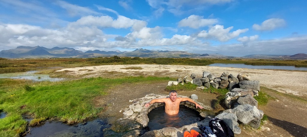 There’s a natural warm lake and hot tub hidden near R54, the road that takes you towards Stykkishólmur. The area around the lake was very squelchy when we visited in a warm august day. There’s no proper footpath to the hot-pot which was on the far side so we took off our shoes and socks and got our feet wet in the warm water. There is only room for one person in the hot-pot but I found it rather pleasant in a stinky kind of way.