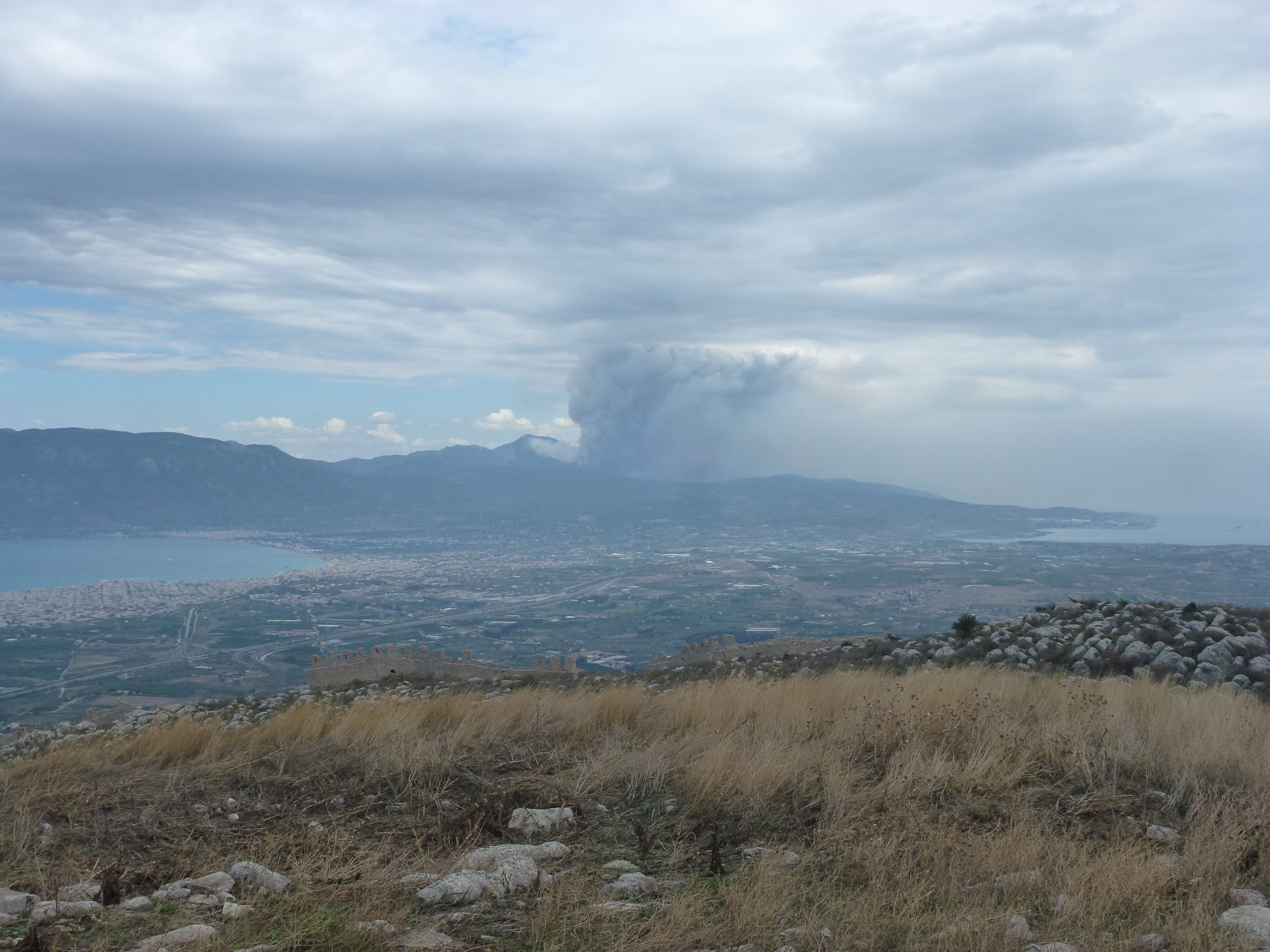Smoke from the fires near Athens viewed from Acrocorinth.