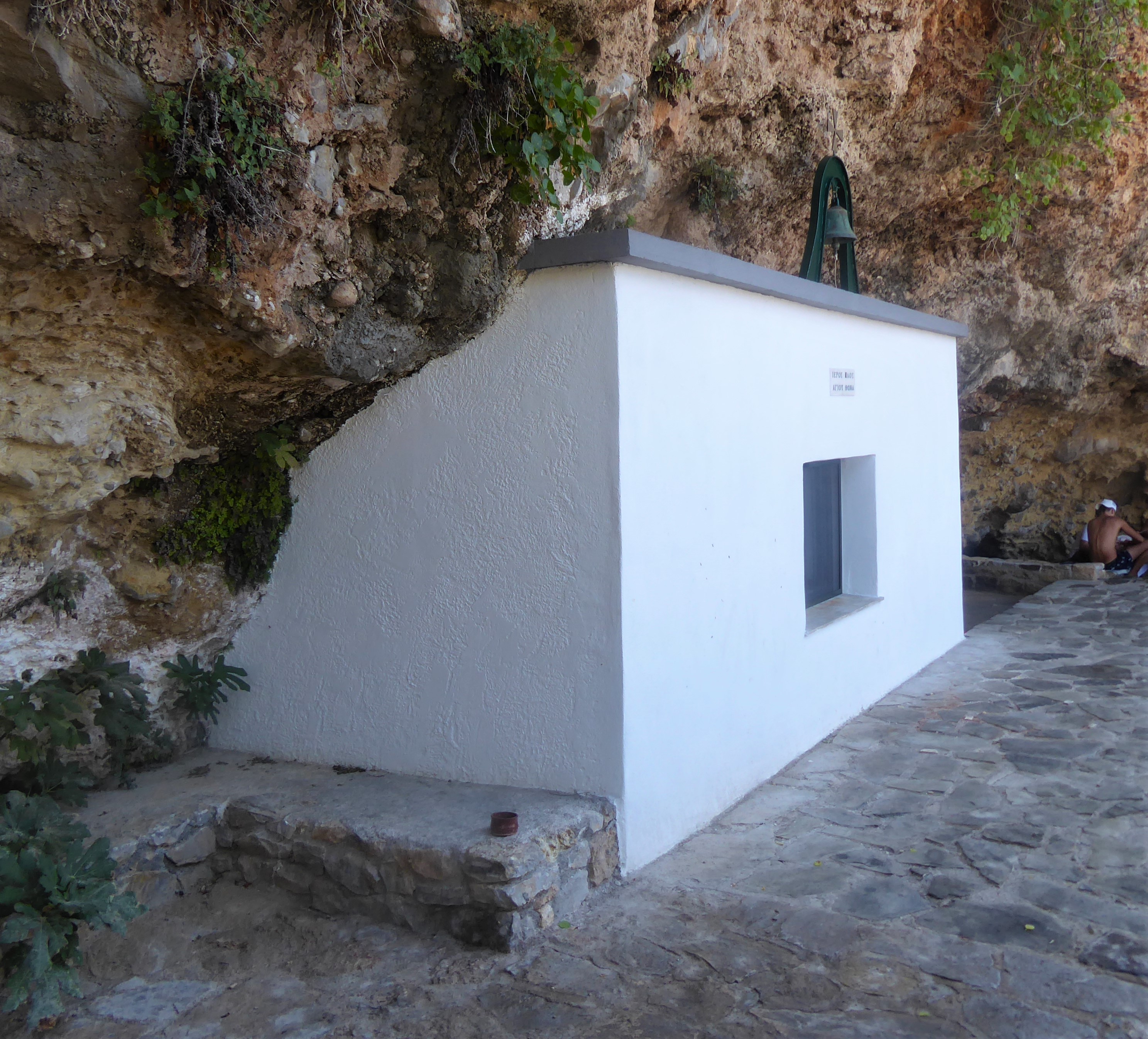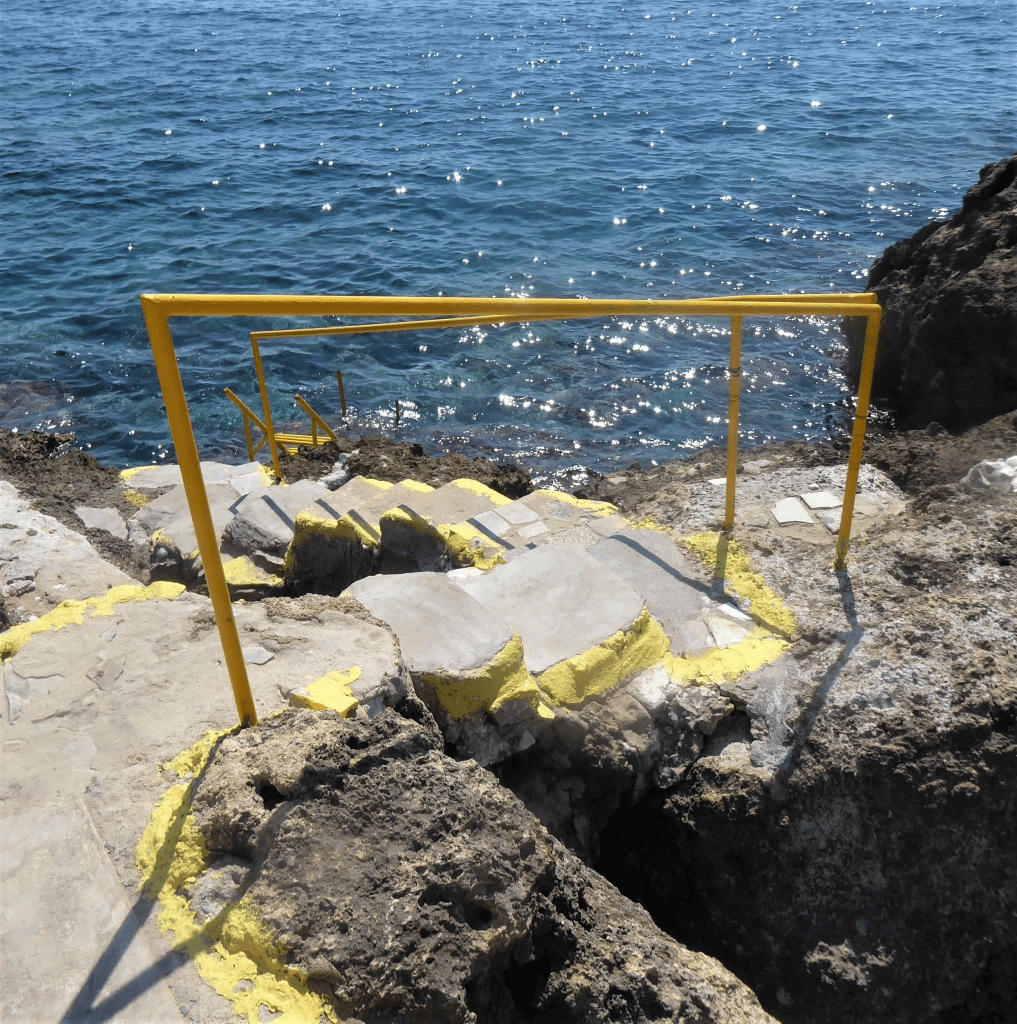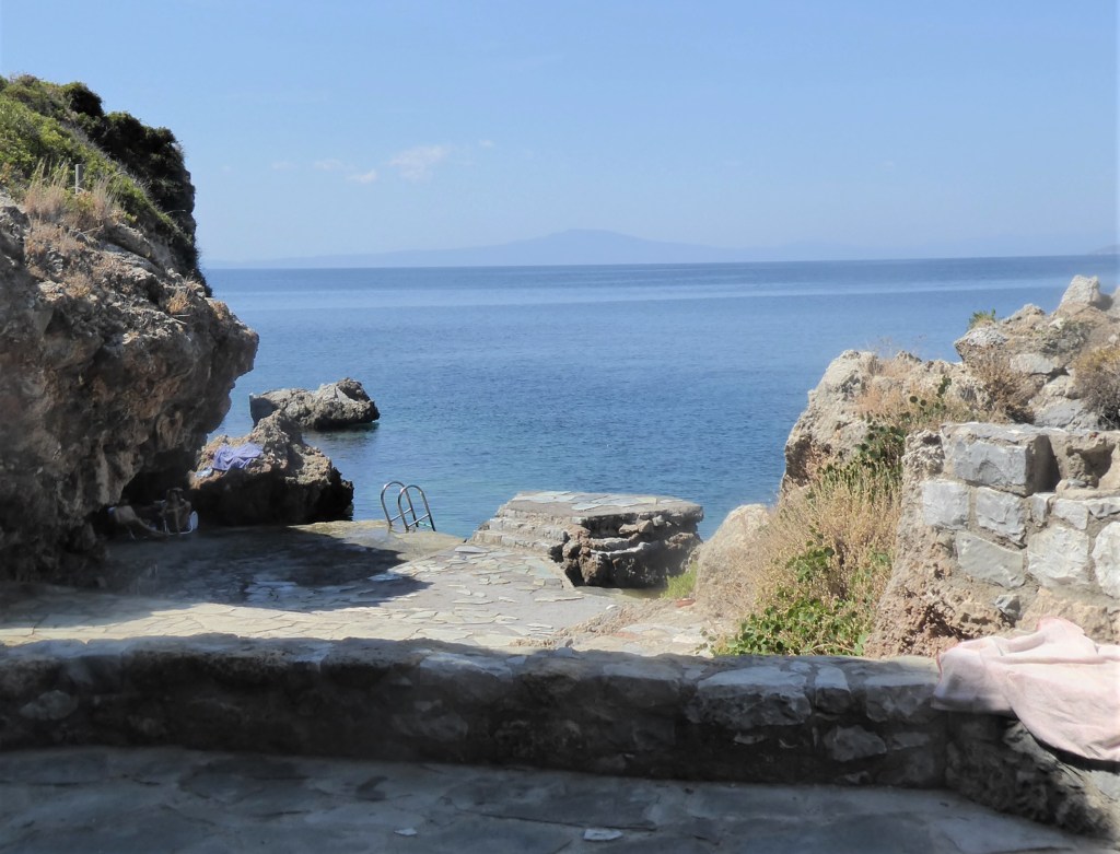 This is my favritist place to swim in Ag Nik. It’s hidden off the main path from Stoupa as it enters the village. Turn down an unmarked path by the ugly empty shell of a building and you will find a short set of steps leading to a lovely secluded swimming platform where you will also find a tiny church built into the rock. There are lovely views across the bay of Stoupa in the distance.