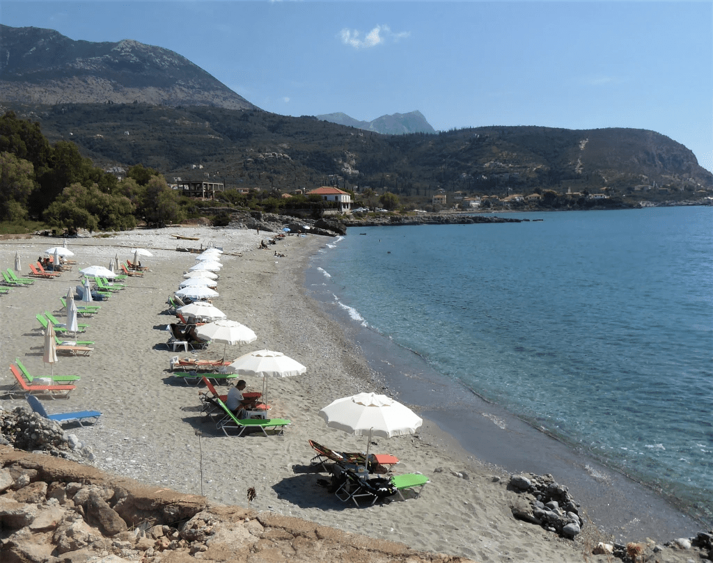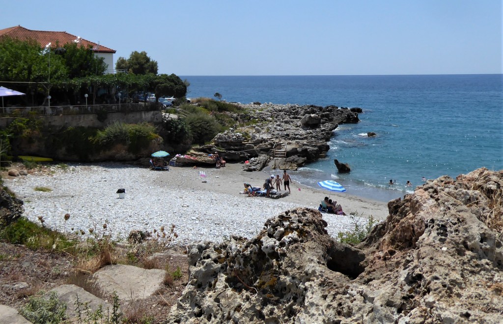 You can swim from the rocks or via steps into the sea from various places in the village including the harbour arm but the main sandy beach [Pantazi] is outside of the village to the south. If you have transport you will find some attractive and more secluded coves between Pantazi and the village of Trachila.