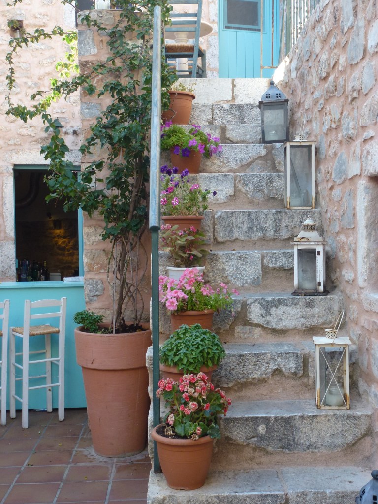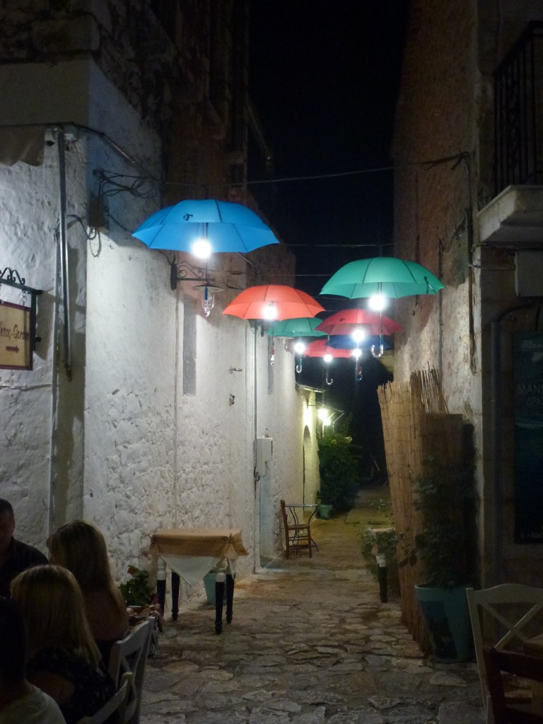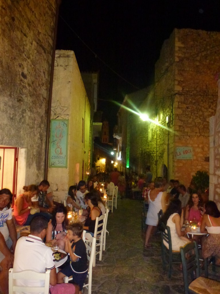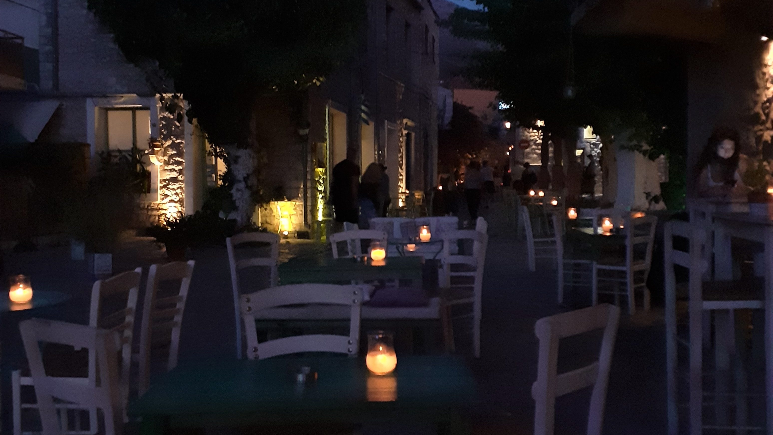 The town, which is peaceful by day comes alive at night and the roads around the square are closed to cars. Sofas and tables appear on the streets outside the bars and tavernas and major sports events may be projected onto screens on the side of buildings. On one of our visits a large screen had been erected on the modern square and a Carry On style Greek comedy was being shown. On another visit a stage had been erected on the square and there was a live performance of Greek music in the evening.