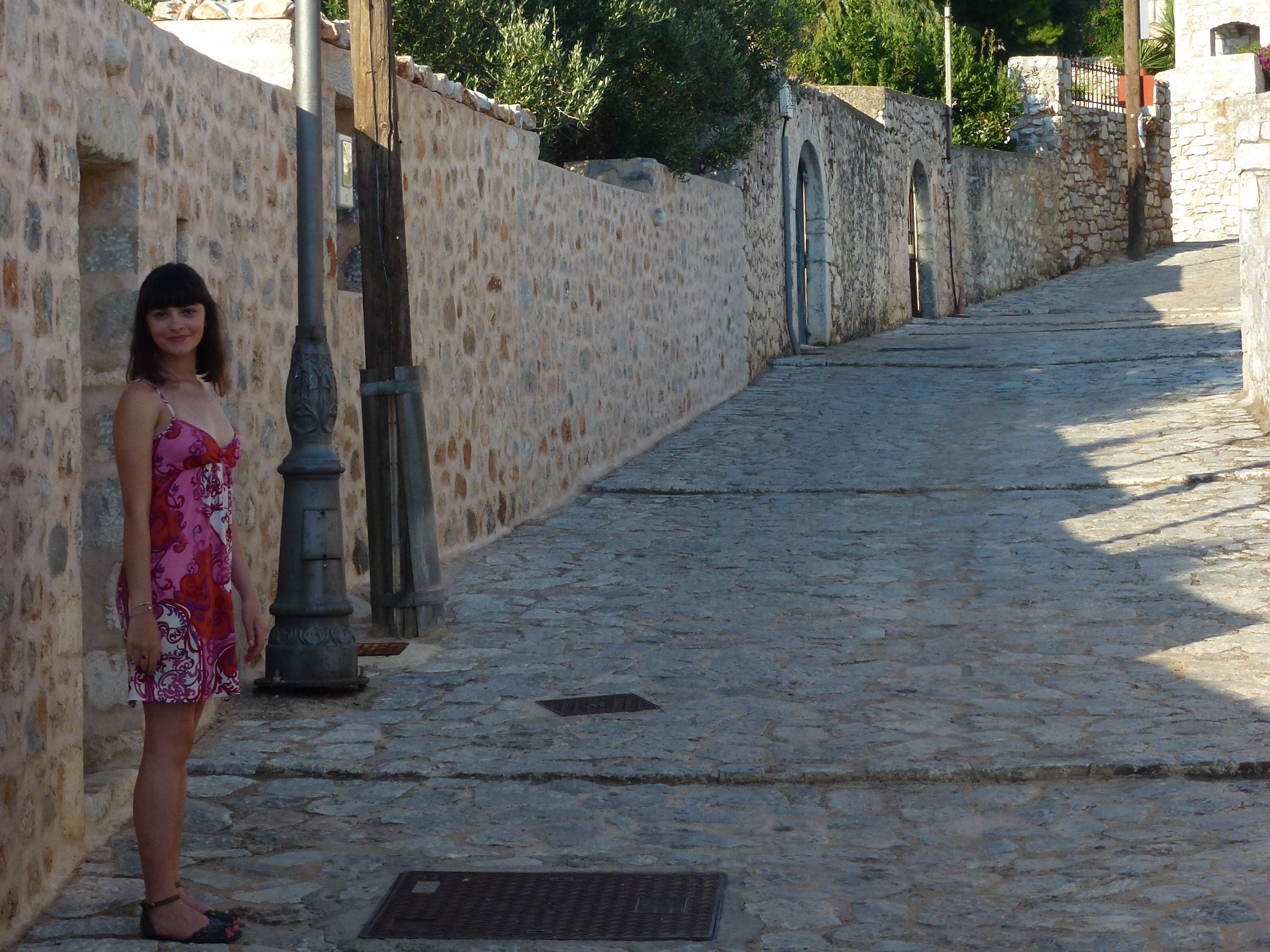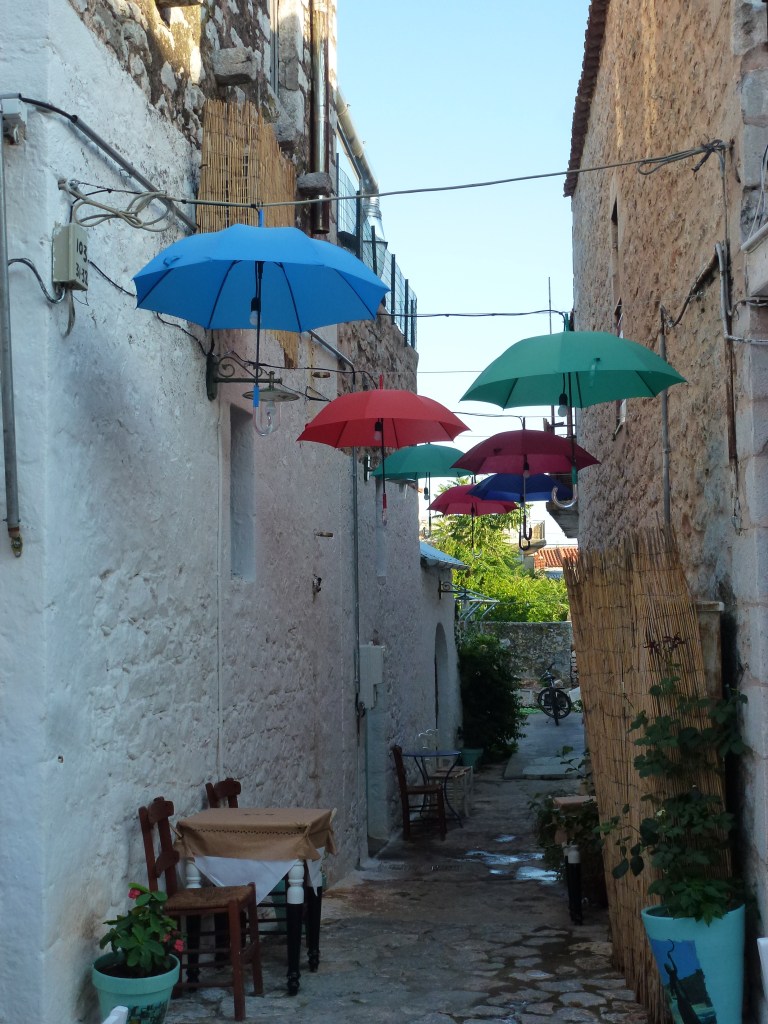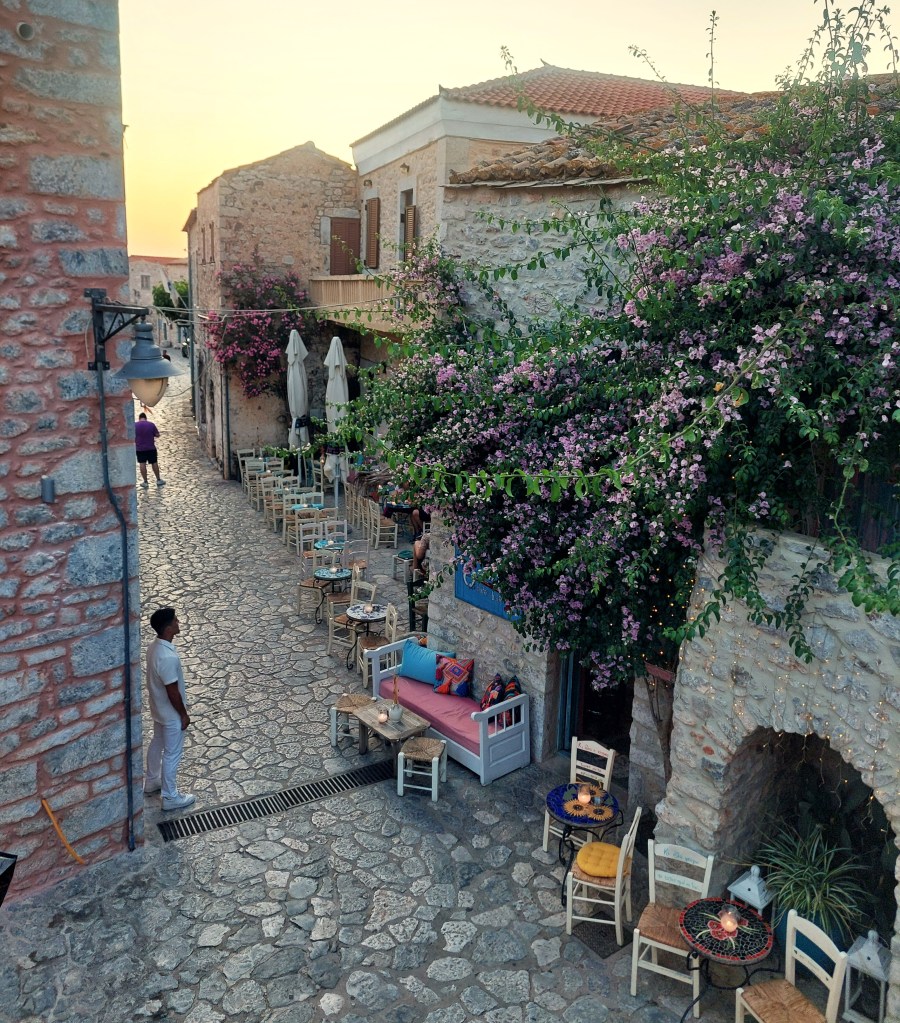The town, which is peaceful by day comes alive at night and the roads around the square are closed to cars. Sofas and tables appear on the streets outside the bars and tavernas and major sports events may be projected onto screens on the side of buildings. On one of our visits a large screen had been erected on the modern square and a Carry On style Greek comedy was being shown. On another visit a stage had been erected on the square and there was a live performance of Greek music in the evening.