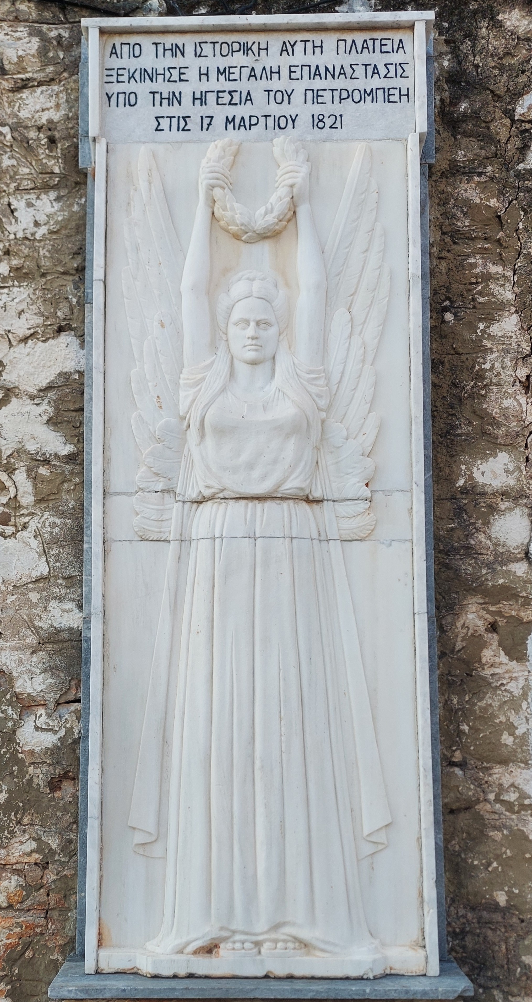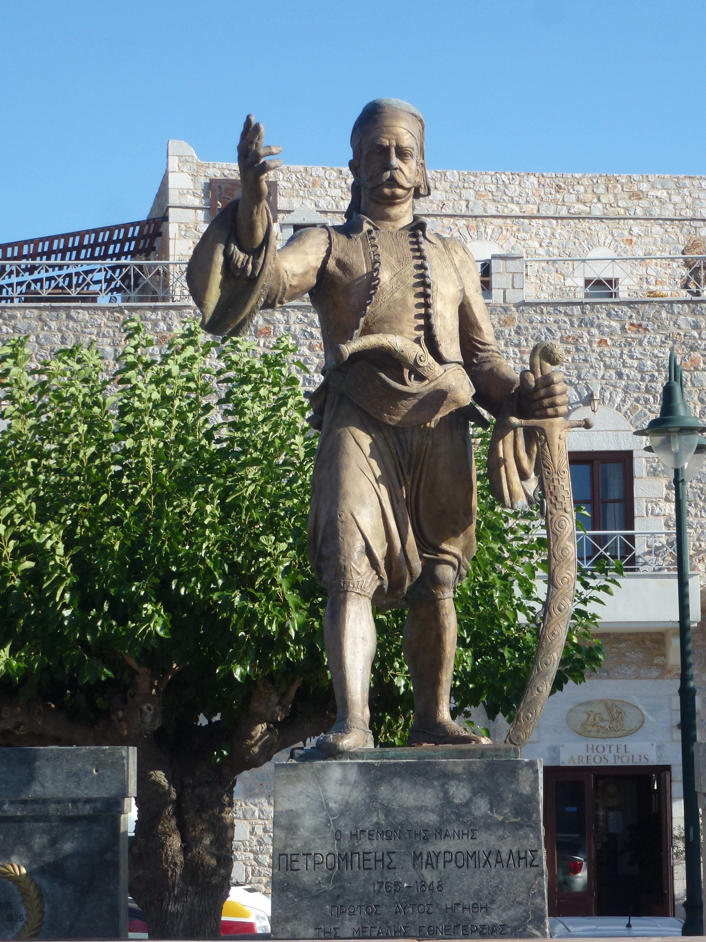 The town, originally called Tsimova had a crucial role in the rebellion against the Turkish occupation and it was here on 17th March 2021 that Petrobey Mavromichelis raised an army that led to the liberation of Kalamata. This feat is marked throughout the town with monuments, [see the photos below and at the top of this page]. The town was renamed Areopoli which translates as the City of Ares, after Ares, the Greek God of war.