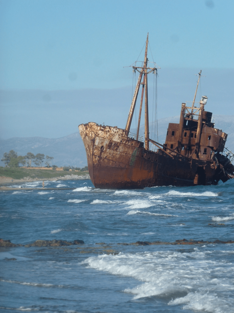 Although the wreck is not actually in the Mani, [it’s in Laconia] it can be clearly seen from Gythio in the bay to the east and it makes sense to include it here. The ship has been deteriorating since 1981. Do not attempt to climb on board the wreck for obvious reasons. It is on Selinitsa Beach and you can see it clearly from the road as you drive past. The beaches here are sandy and it’s a lovely place for a swim.