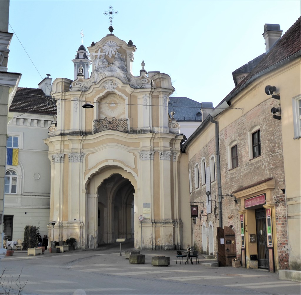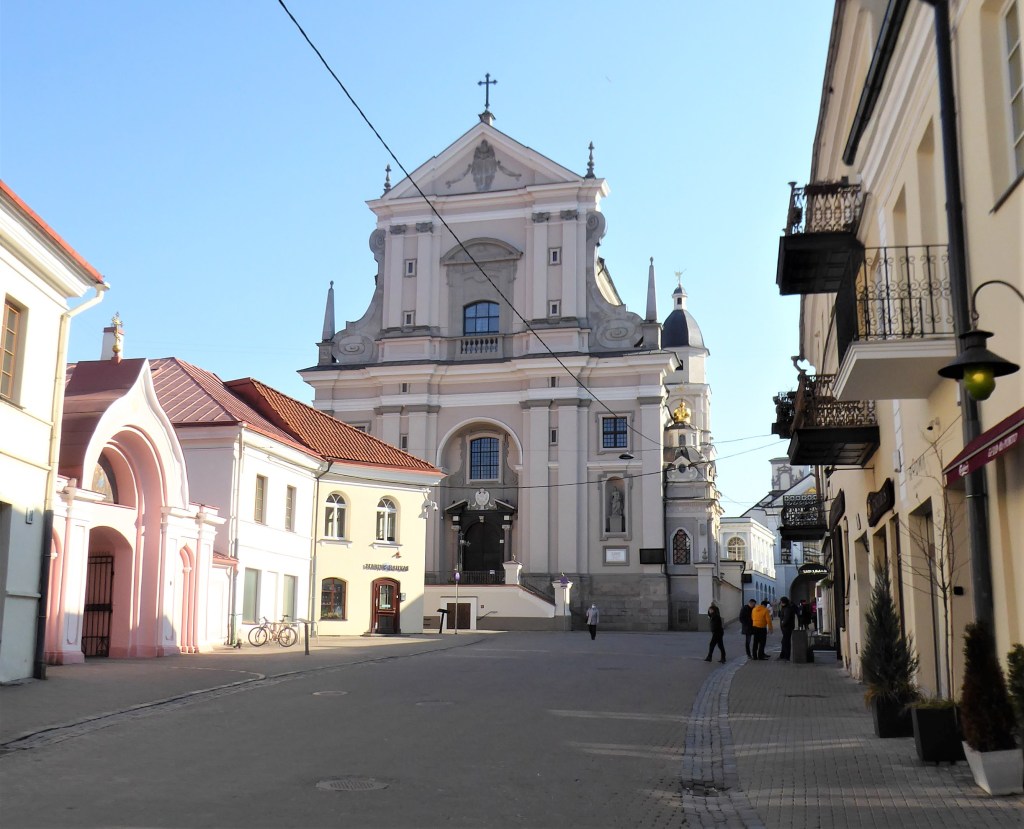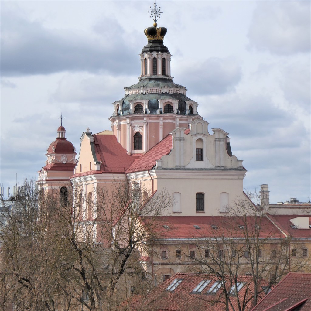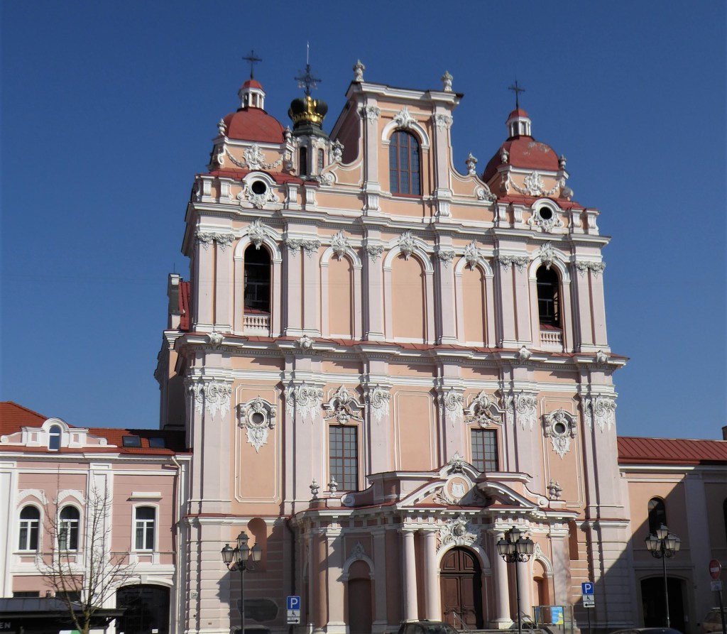 This church was founded in the early 16th Century but has burnt to the ground on three occasions and has been rebuilt each time. What we have now originates mostly from the early 18th Century and is a fine example of Baroque architecture. I love the 18th century addition of a crown which can be best seen from the rear – there are good views of this from the Bastion of Vilnius Defensive Wall. [see more in my Museums page]. Sadly, it was locked when I visited.