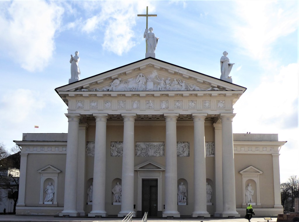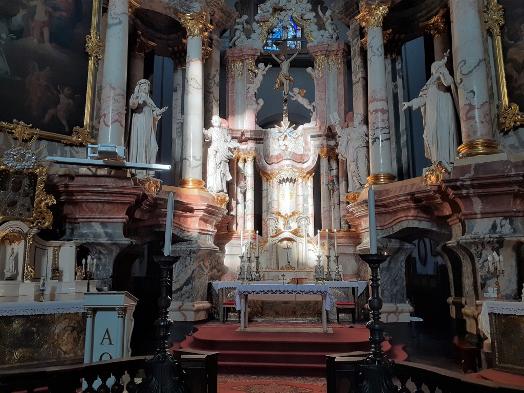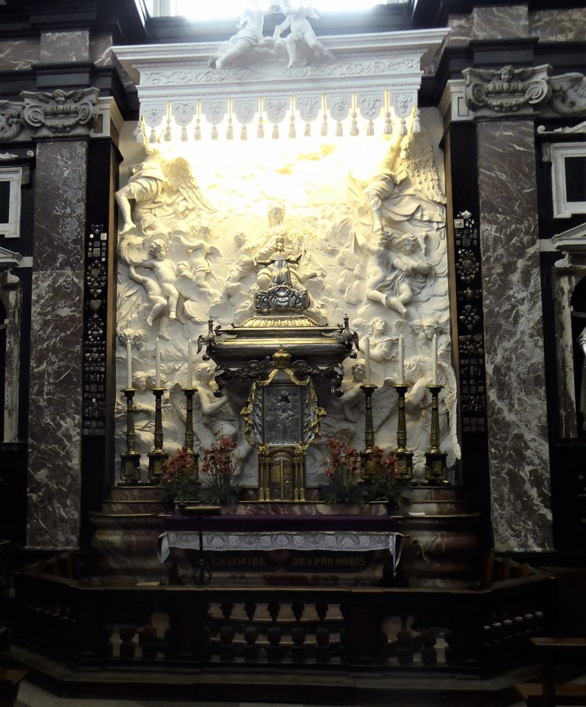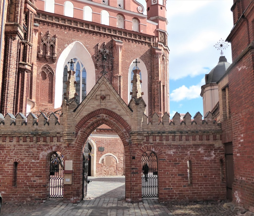 This church was founded in the early 16th Century but has burnt to the ground on three occasions and has been rebuilt each time. What we have now originates mostly from the early 18th Century and is a fine example of Baroque architecture. I love the 18th century addition of a crown which can be best seen from the rear – there are good views of this from the Bastion of Vilnius Defensive Wall. [see more in my Museums page]. Sadly, it was locked when I visited.