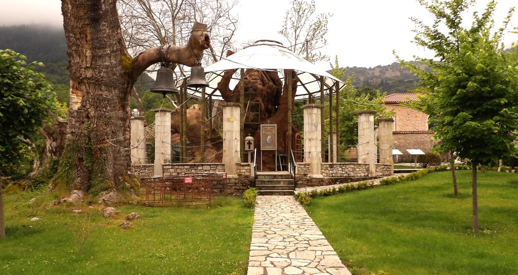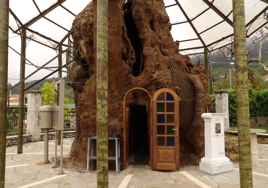 A half an hour drive, north of Kalavryta on the edge of the small village of Plantaniotissa is a very strange church indeed which is dedicated to the Virgin Mary. It’s built into the trunk of a large plane tree unlike Agia Theodora of Vasta which has a tree growing out of it. It’s a tiny structure with room for 15 people which I think would be a bit of a squeeeze! The church is now is protected by glass hat. The gardens are a pleasant place for a picnic although the on-site toilets are a bit basic. If you are heading here from Kalavryta the road does turns to a dirt track for the last part of the journey but it’s perfectly fine in a standard car if you take it carefully. The journey here from the north takes you through some lovely mountains and valleys.
