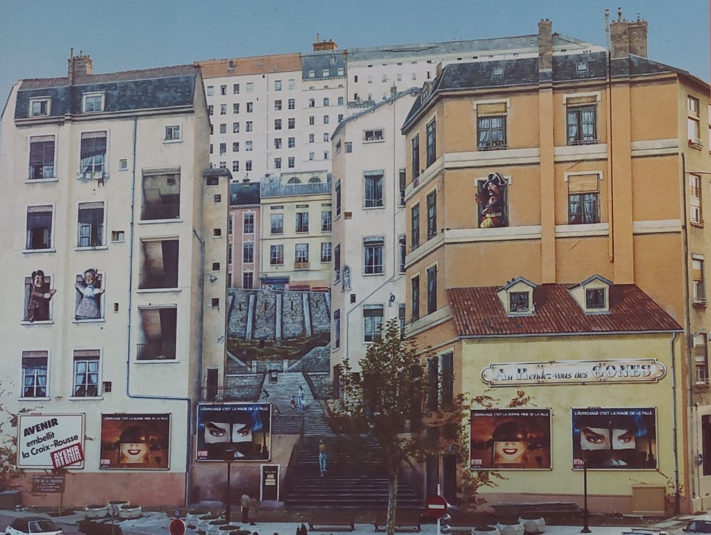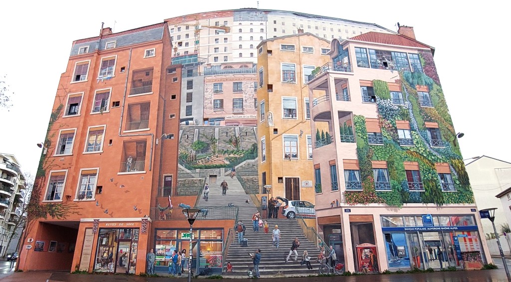 This amazing mural on the corner of Boulevard des Canuts and rue Denfert Rochereau is near Henon Metro. It was created in 1987 and the people in the mural are based on actual inhabitants. The mural has been updated a couple of times [in 2013 on the last occasion] and the inhabitants are appropriately aged. It is the largest wall painting in Europe. If you head through the passage on the left there is information and photos about the mural on display on the walls.