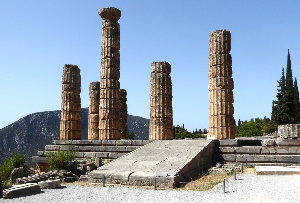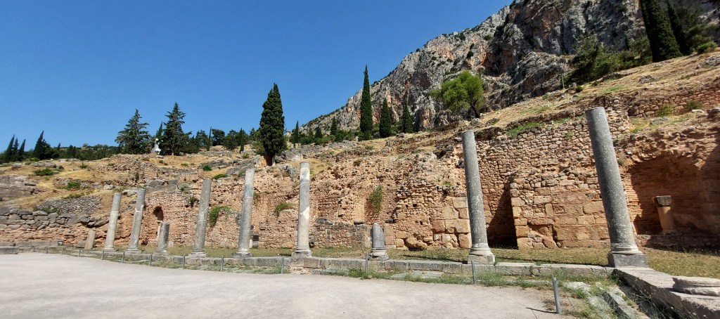 As you continue uphill along the Sacred Way you will approach The Temple of Apollo. Only the foundations remain, so the six Doric columns that you can see have been reconstructed by the original excavators.