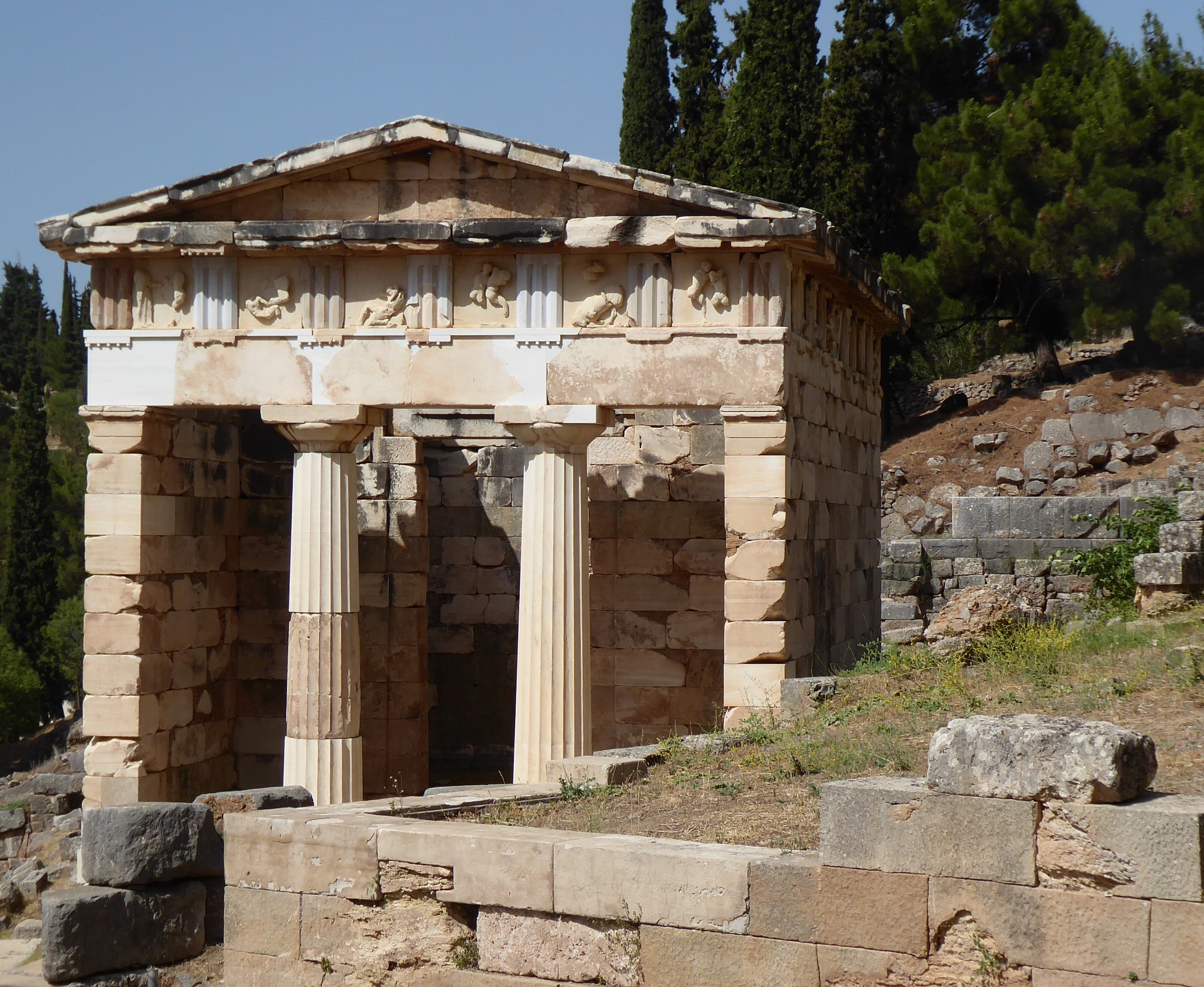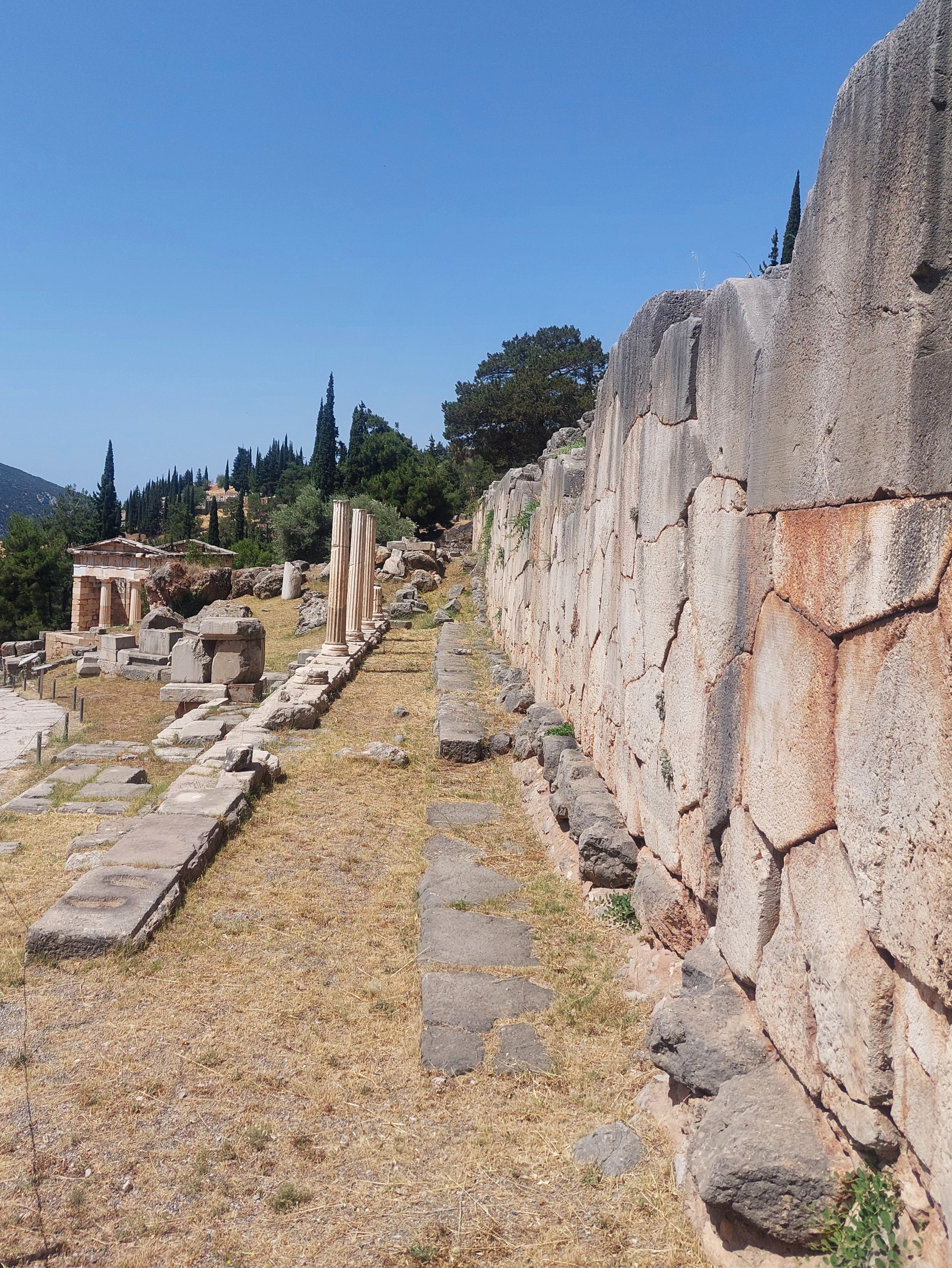 You enter the site along the Sacred Way, a path which snakes its way from the Roman Agora up the mountain to the Stadium at the top. The path used to be lined with thousands of statues, only the bases remain today. One of the first features you pass is the Monument of the Admirals which was erected by the Spartans to celebrate their victory over the Athenians. There are several Treasuries lining the path of lower part of Delphi. These were small buildings where offerings were stored for Apollo. The most notable treasury is that of the Athenians which was reconstructed in the early 19th century. You soon reach the Polygonal Wall which if you look closely is covered with inscriptions.