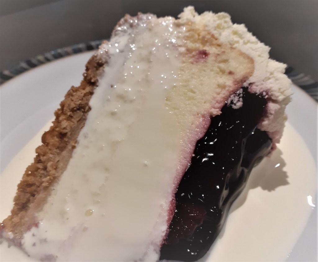 Ingredients: This should be enough to feed around 14-16 peepses or one greedy bastard! – 1250gms of full fat cream cheese [such as Philadelphia], 10 fluid oz of granulated sugar, 1.5 tsp of vanilla essence, 4 large eggies, 200gms of crushed digestive biscuits, 55gms of butter [salted or unsalted], around half a pint of full cream to decorate and pour over. Fruit of your choice to decorate the top or you can use a tin of pie filling [black cherry works well].