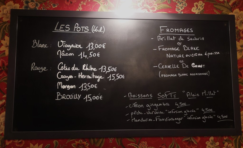 We had our first meal in Lyon at this Bouchon and it was a brilliant evening. A simple menu on a chalk board, a relaxed atmosphere and our waitress loved us so much she gave us free glasses of Châteauneuf-du-Pape, Yay!