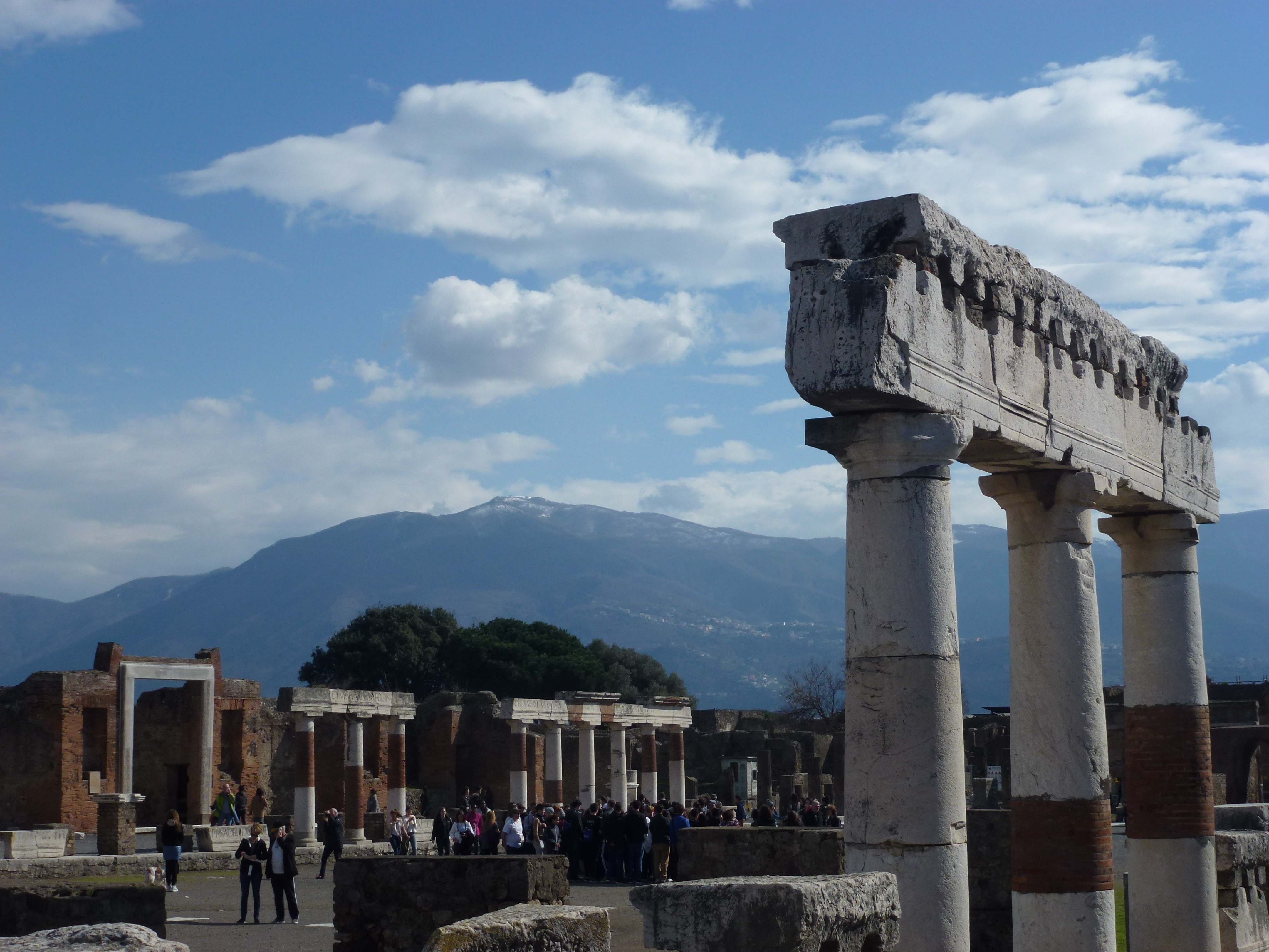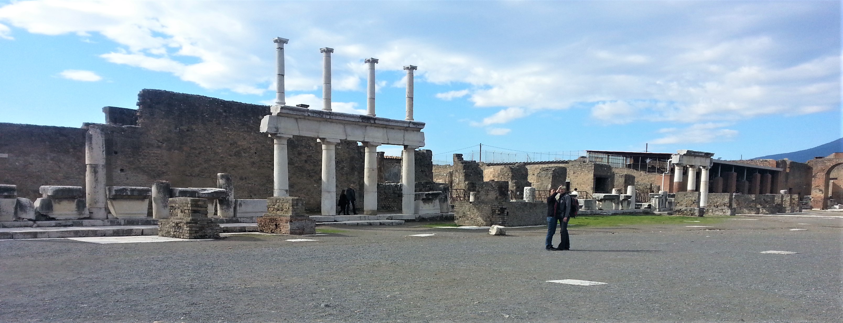 The Forum was where the inhabitants would congregate for social and religious meetings. The Temple of Apollo is on the East side of the square. Vesuvius can be seen clearly from the Forum, which is the highest spot in Pompeii. Not far from the Forum is The Macellum which was the old meat and fish market.