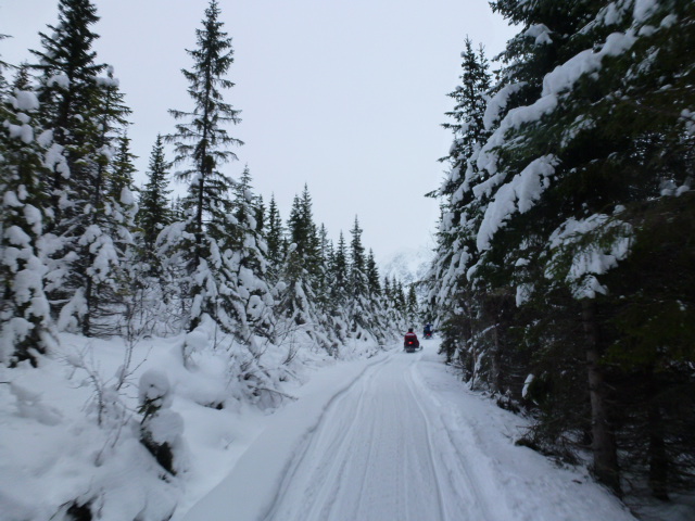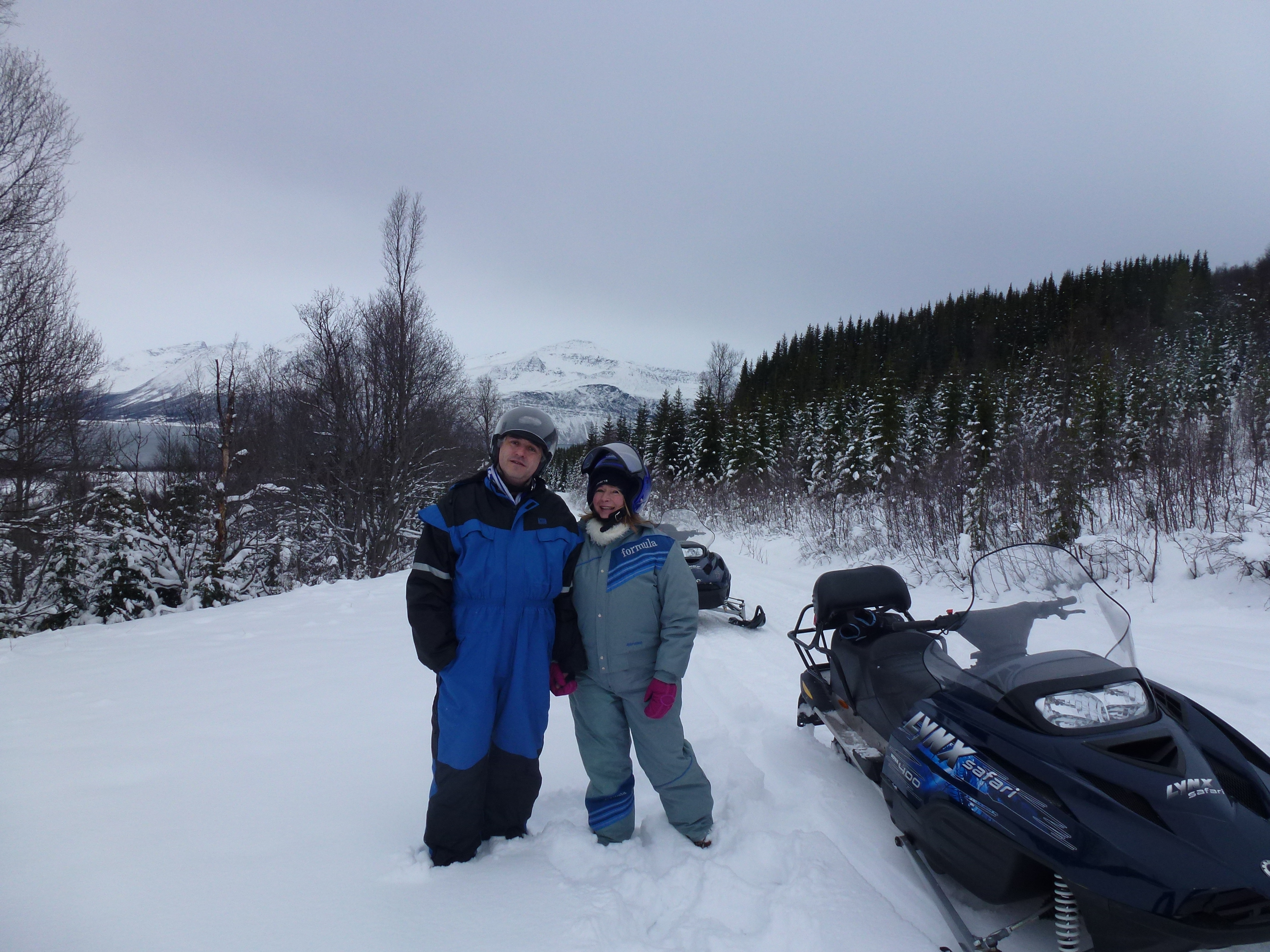 We were given instructions on how to drive the surprisingly large snowmobiles which were comfortable with heated handlebars. Leashia and I had never been on a snowmobile before but they were not difficult to master although, that said, another couple did manage to roll theirs and were stuck underneath briefly until they were rescued. I could not stop laughing! It was absolutely wonderful and exhilerating driving through the mountains and valleys, one of our best experiences ever!