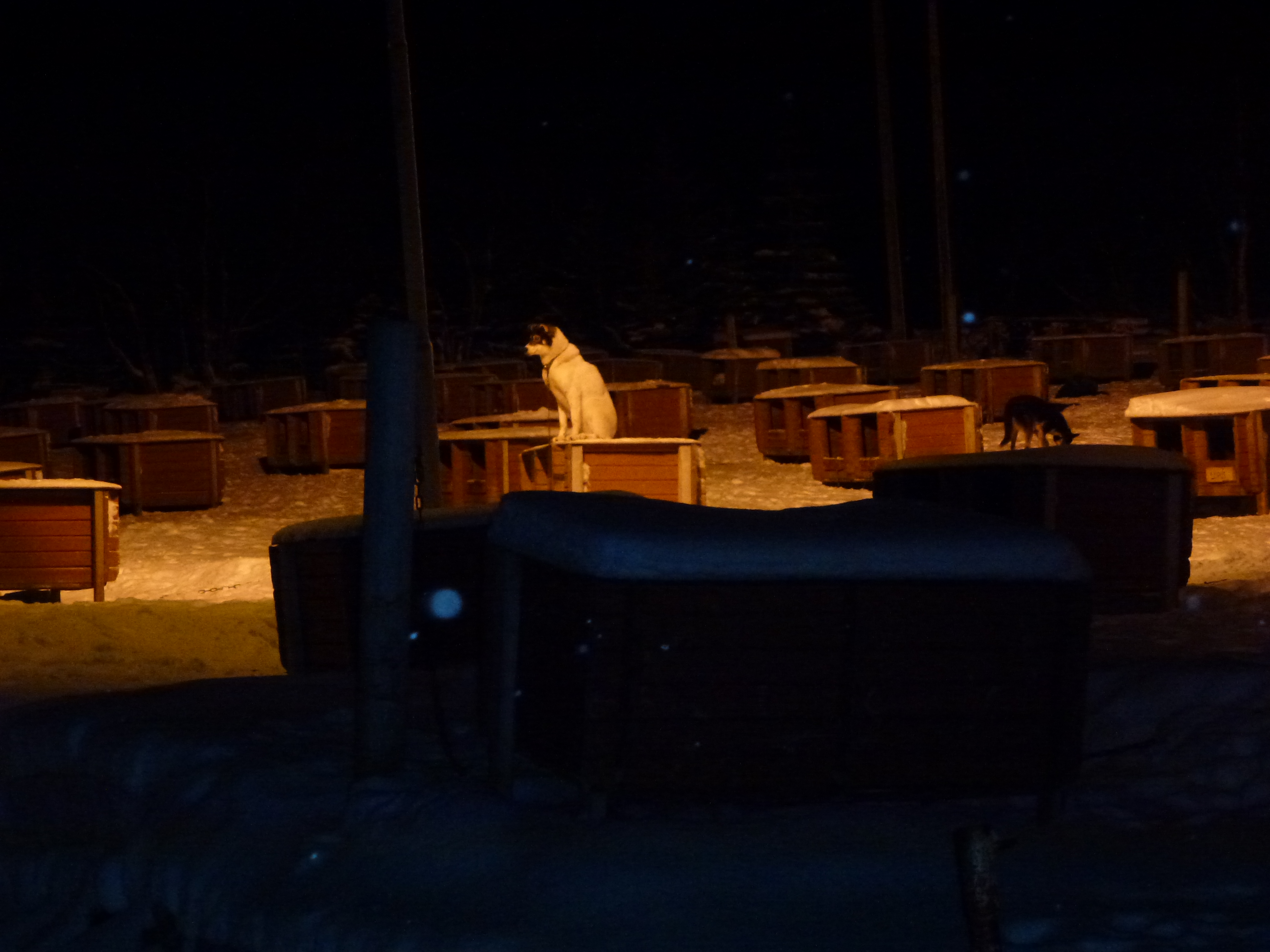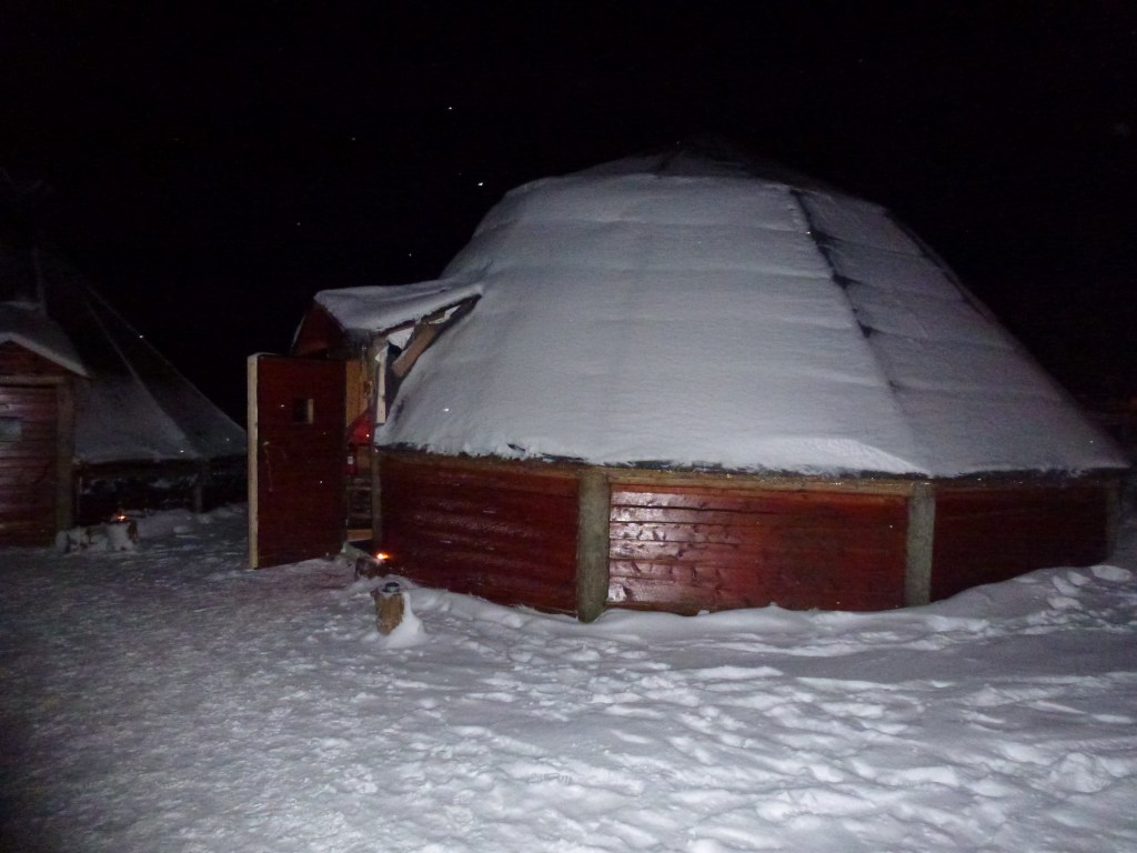 The husky sledging excursion was my birthday present from Leashia. We chose to go at night in the hope that we may see the Northern Lights as a bonus. This did not transpire as it was a cloudy night but it was fun to be pulled along by a team of doggies. I have to say that it was not very comfortable with snow flying in our faces but it could have been worse as it could well have been faeces in our faces! We had the lovely view of dogs bottoms bouncing in front of us, sometimes pooing as they ran ! Nice.