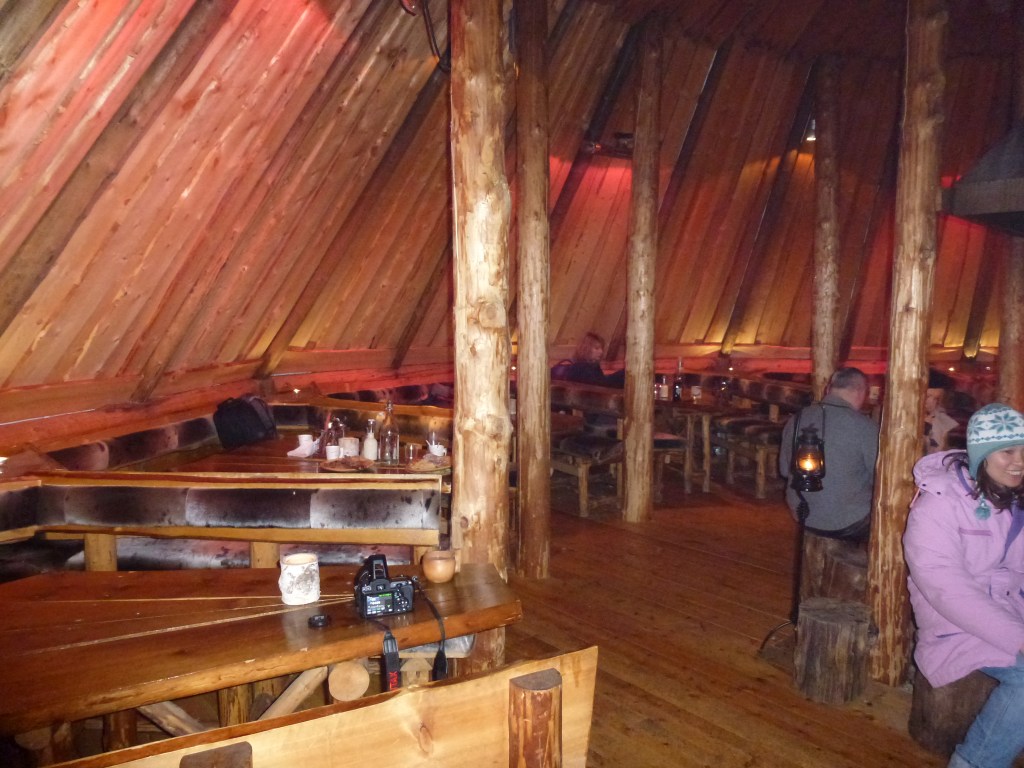 The trip included dinner in a traditional style wooden Sami hut called a Lavvu. We were served reindeer stew which was very pleasant [I am unsure of the vegetarian option]. We also got to see the huskies in their doggy village. The dogs were polite, but not cuddly, and seemed very happy despite not having any central heating.