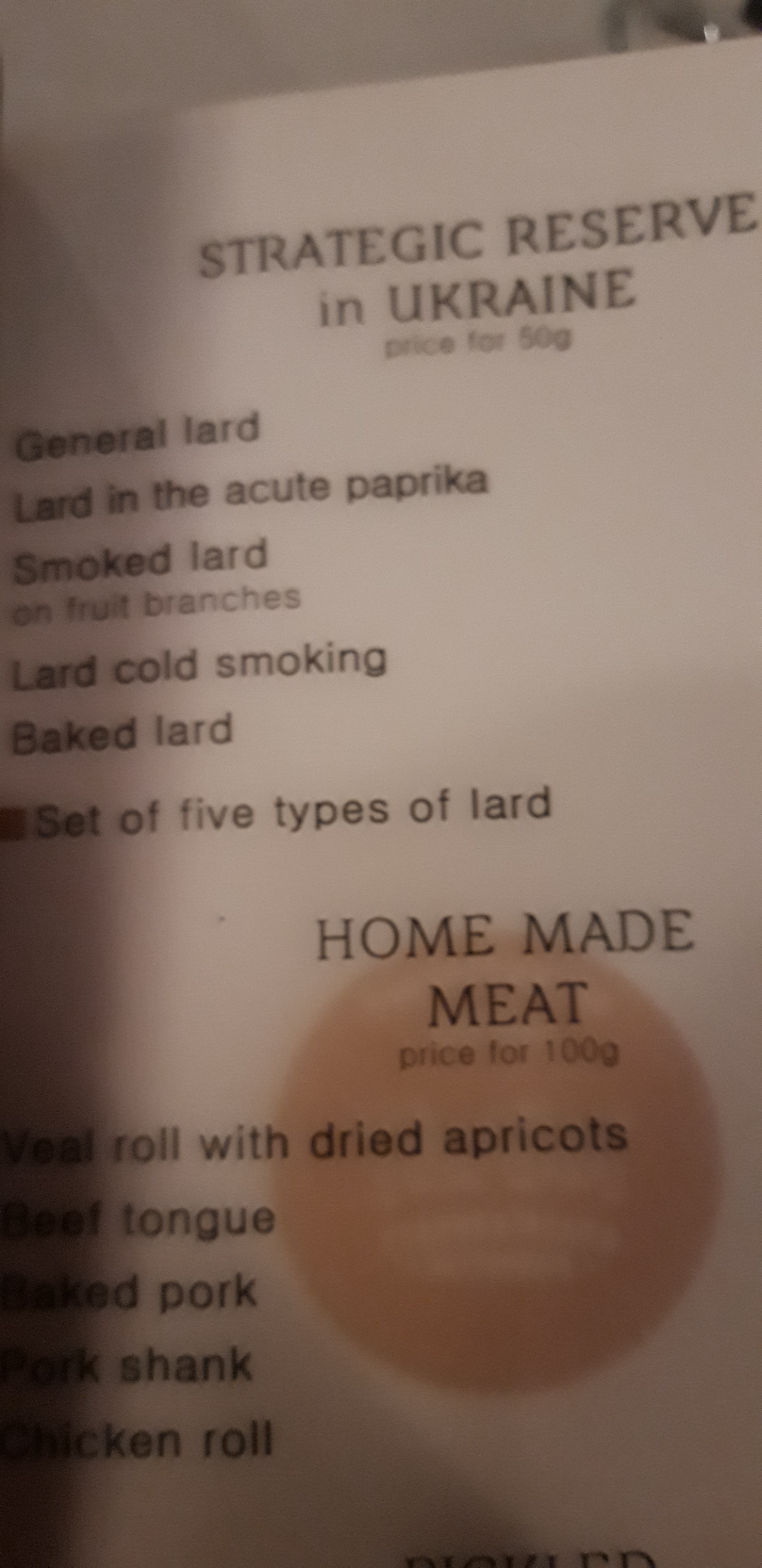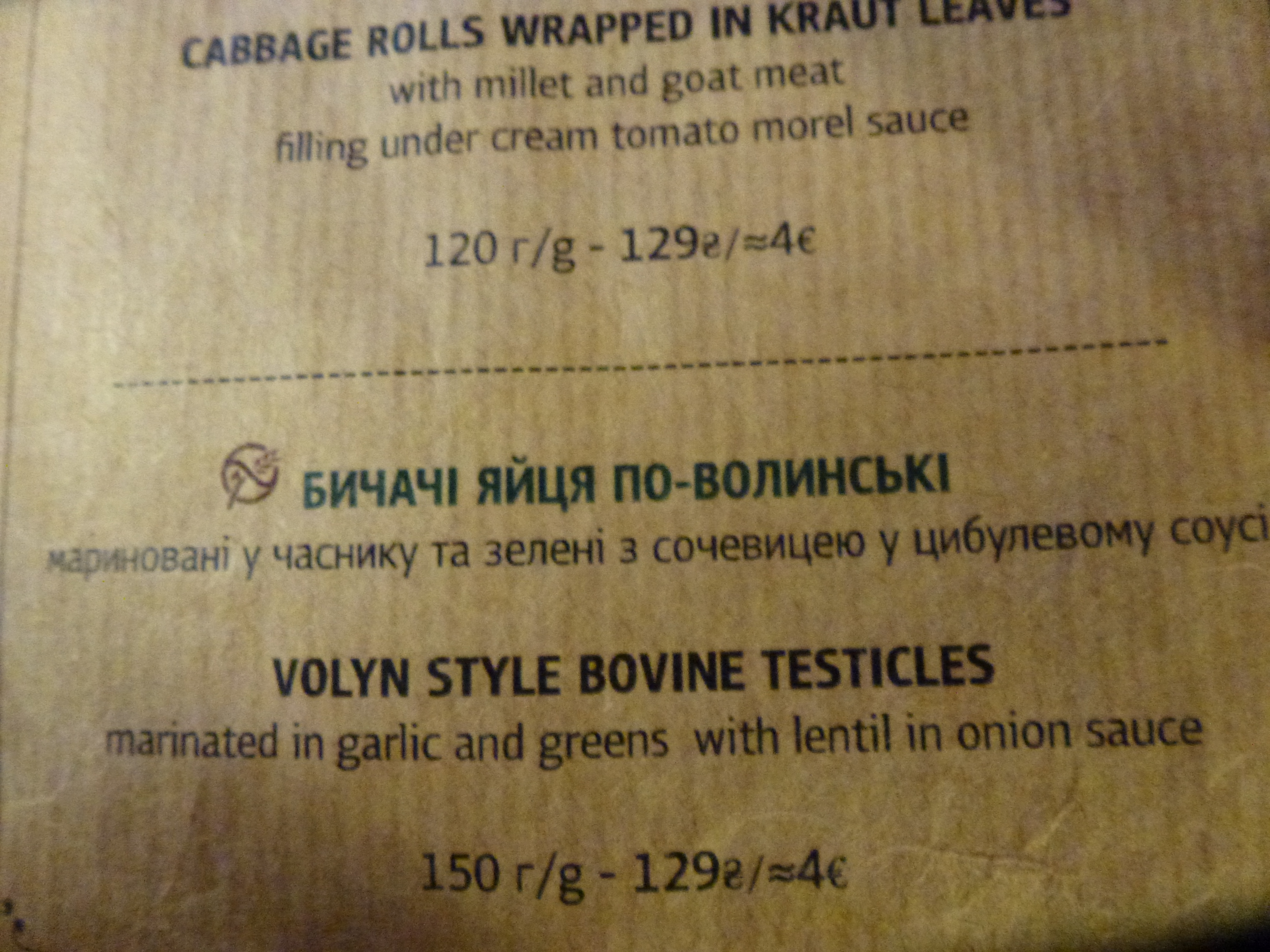The menu’s in Kiev were diverse and interesting. There was plenty of choice when it came to lard and testicles !