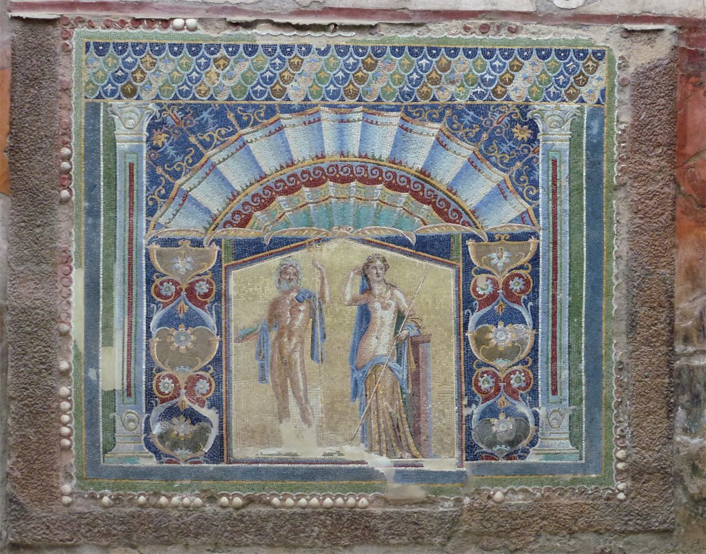 The Villa dei Papiri was sadly closed on our visit but there are some wonderful exhibits from the Villa in the Museo Archelogico Nazionale Museum in Naples. Fortunately many other houses are accessible such as the House of Neptune which has some beautiful mosaics on the wall and House of the Stags. The male and female bath houses have lovely floor mosaics also.