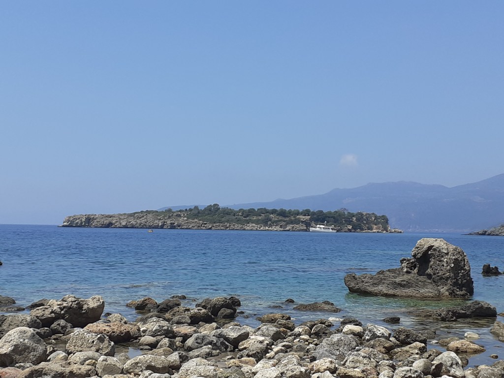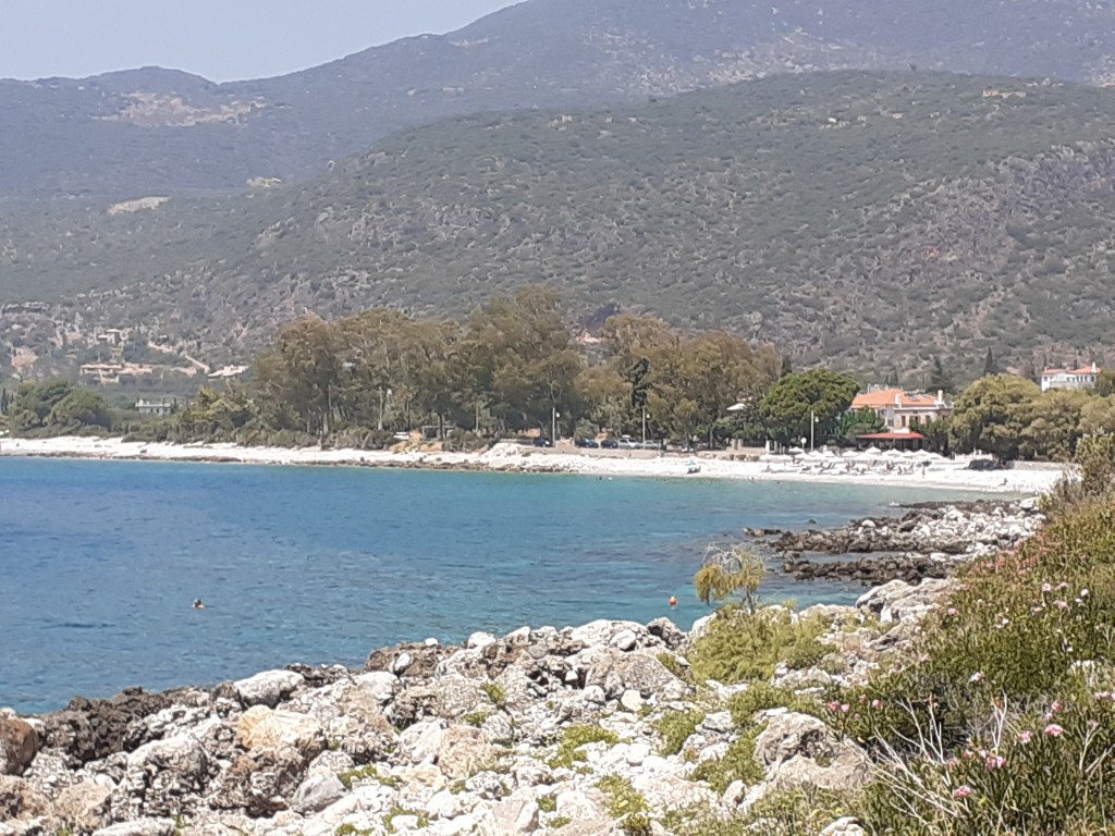 The bay where Patrick Leigh Fermor lived is stoney on the left and rocky to the right but is a good place to bathe and snorkel but can get quite busy. You can park in the road that leads down to the bay.
