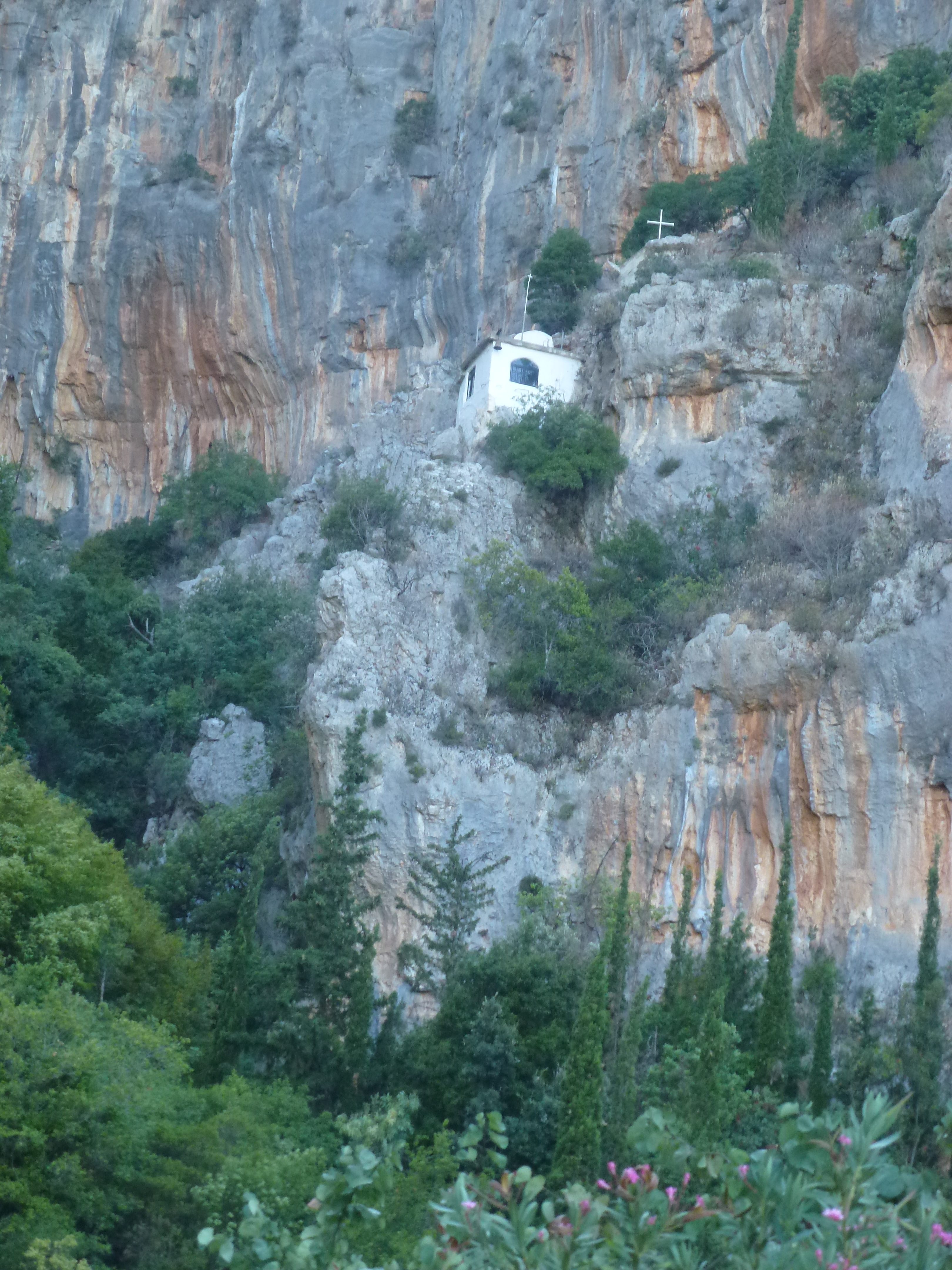 There are a couple of tiny chapels ‘hanging’ on the cliffs above Kyparissi. There are paths there if you want a steep and scary climb. Maybe next time for us.