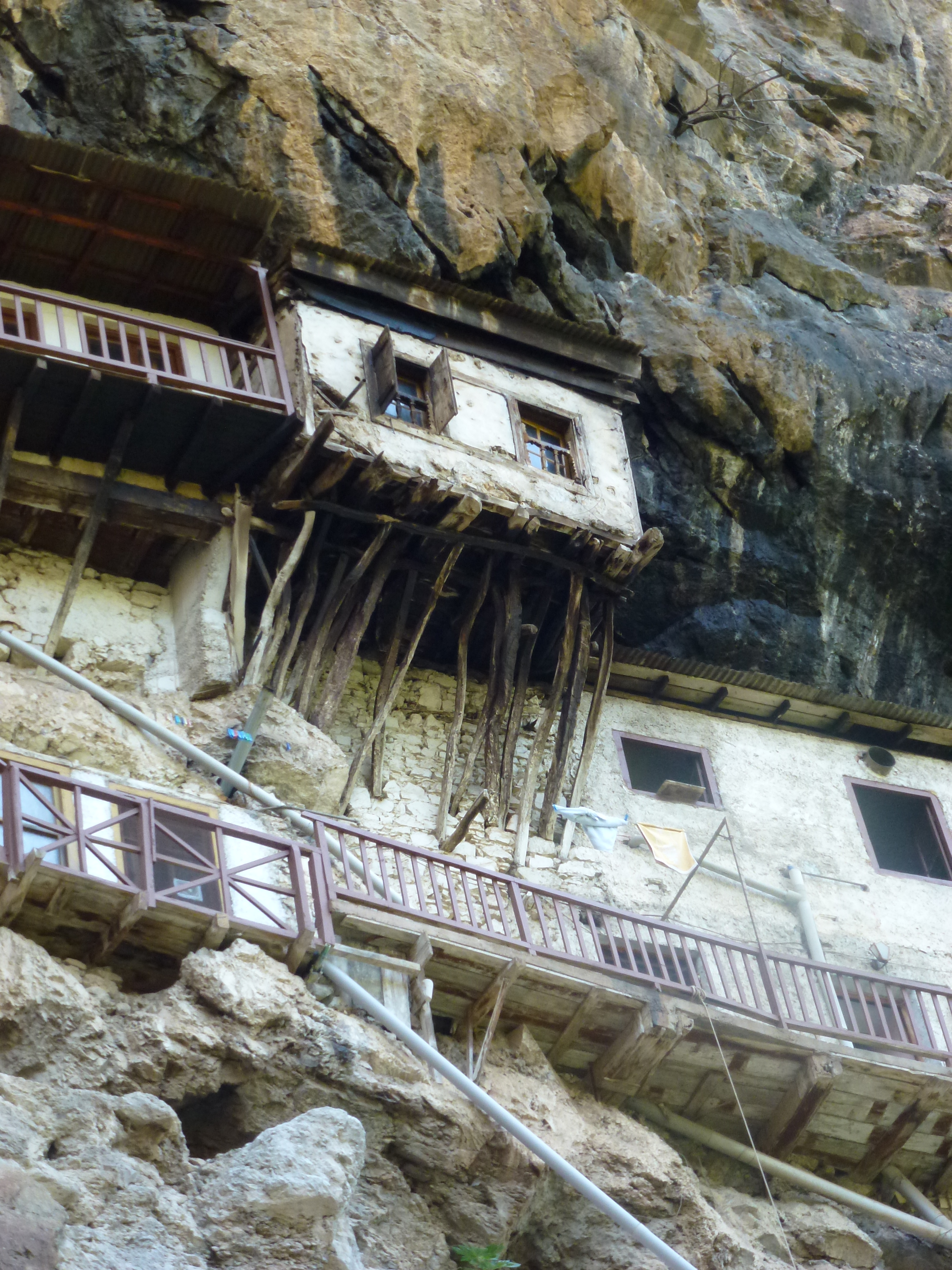 A slow meandering road takes you to the Prodomou Monastery situated on the opposite side of the Gorge to Philosophou. Like Philosophou its setting is spectacular, a row of mostly wooden buildings seemingly stuck to the edge of the gorge and resting on a series of fragile looking poles!