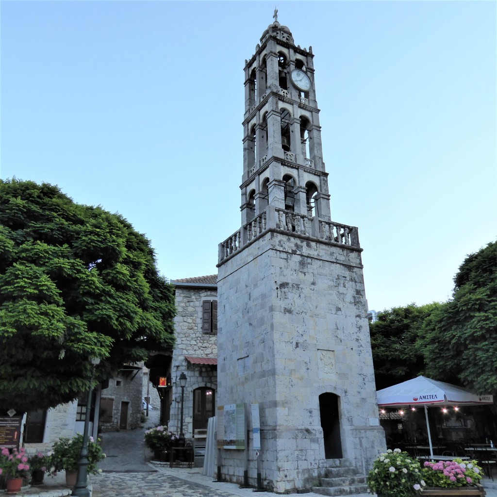 There are some lovely craft shops in the village and a pleasant square edged with Tavernas and an impressive 19th century bell tower. There is a large medieval church just opposite.