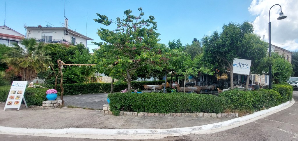 We had a lovely lunch by the sea at Στη βρύση– Sti vrysi, which translates as at the tap, [and you also may find it called Zur Quelle which I think is German]. We also had a wonderful fish dinner at To Pareaki tis Argo. However, perhaps the best discovery [and the most bizarre] was to be found behind the fire station….