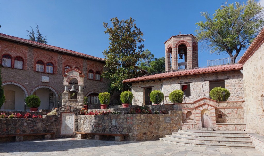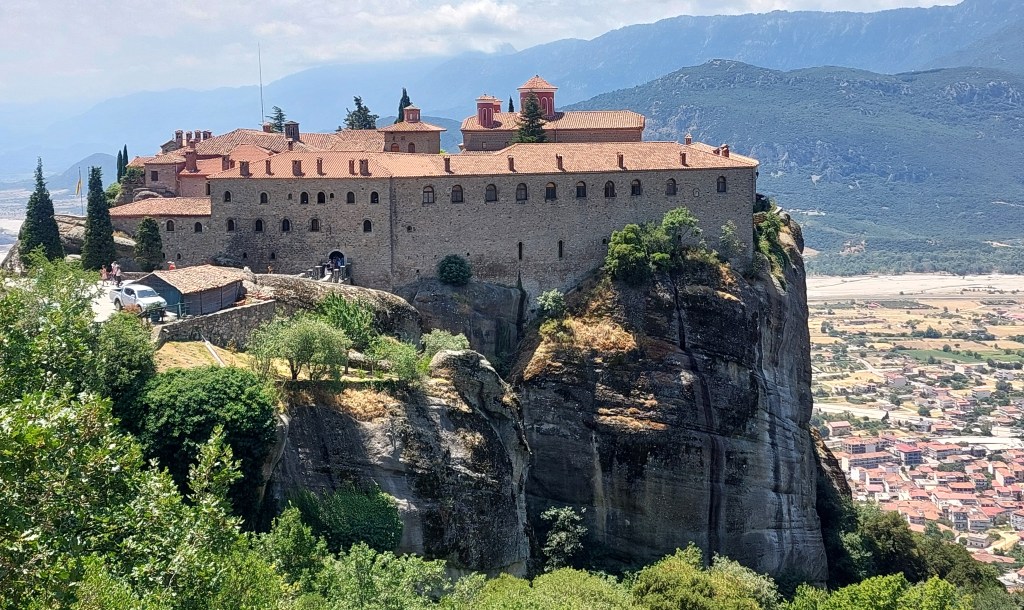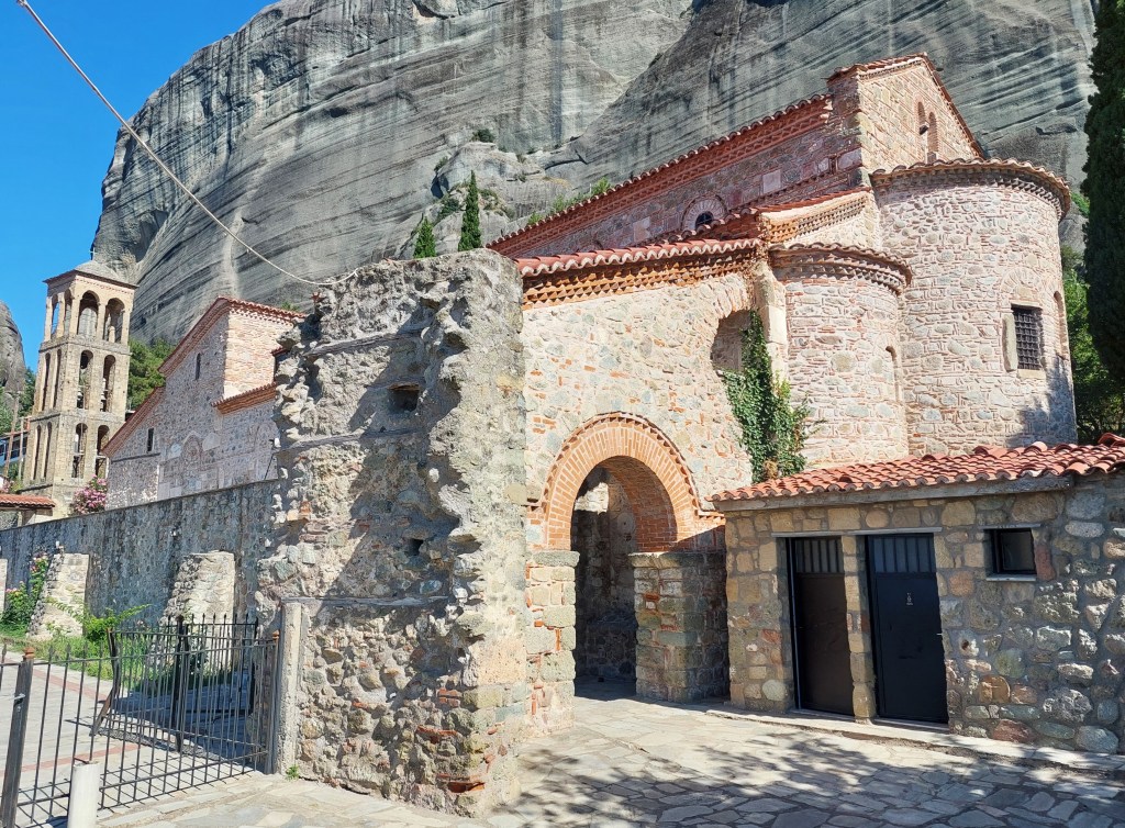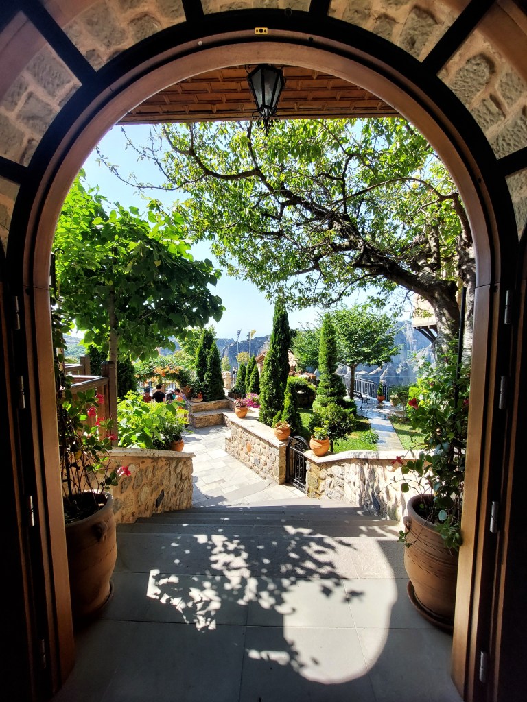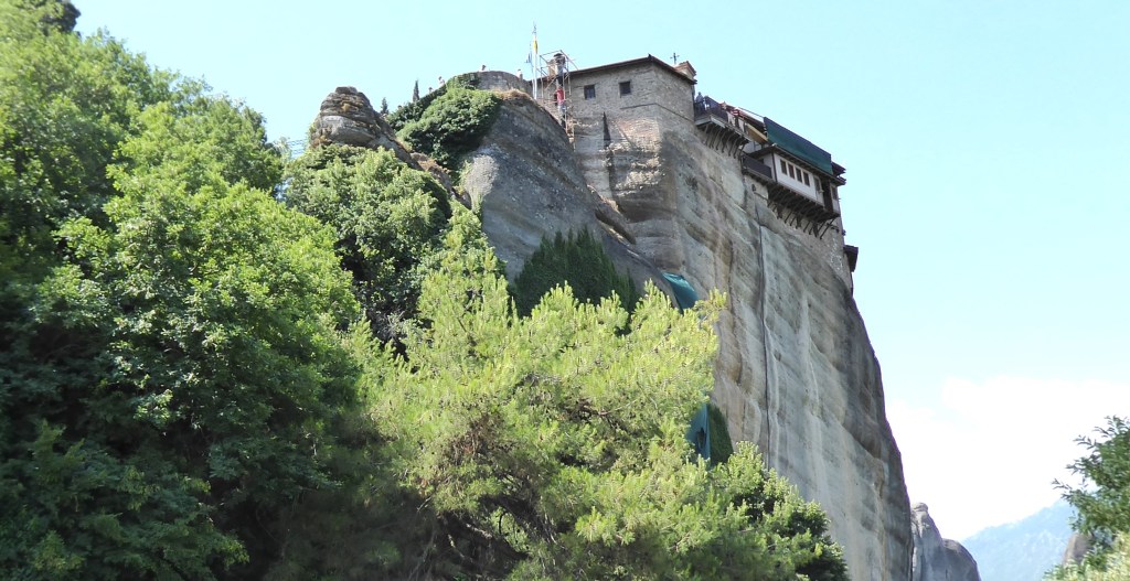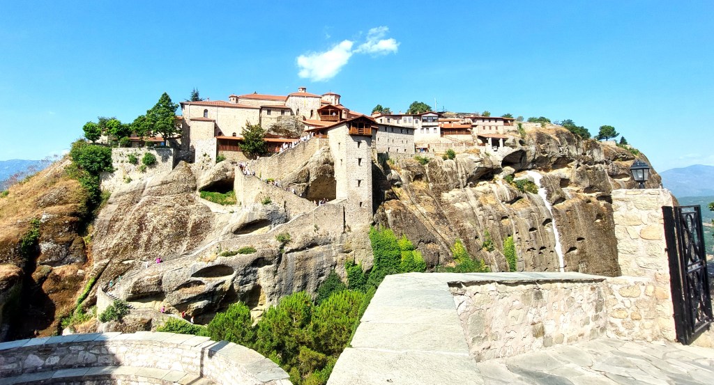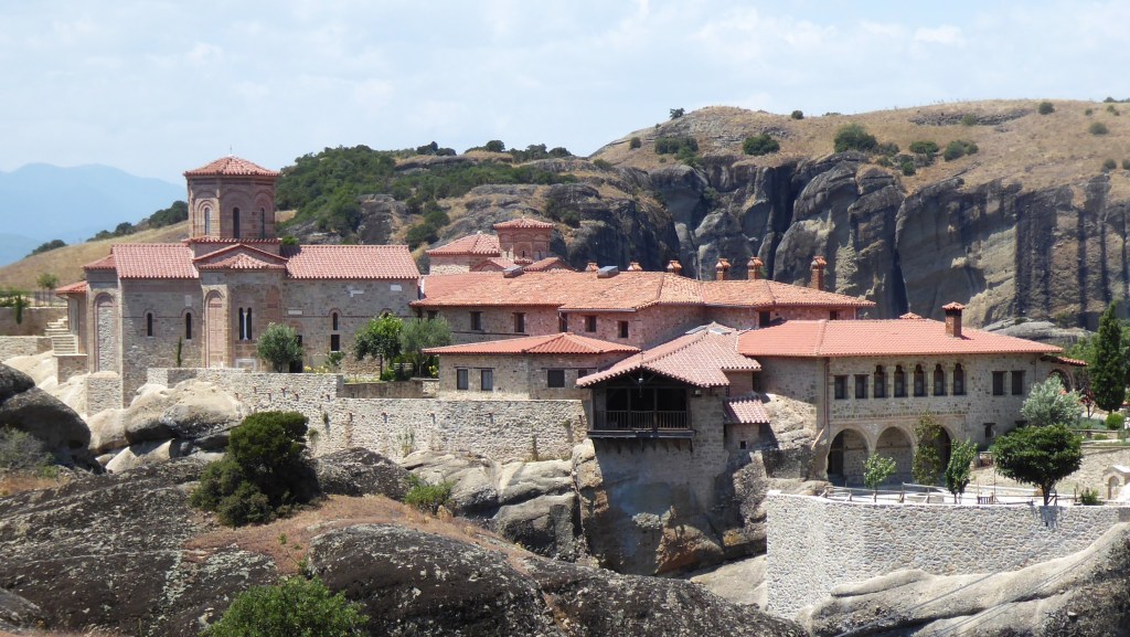 We visited the Monastery of Great Meteorou first and were in a small queue waiting for the doors to open. There are around 300 steps to the entrance of this one so perhaps that was a good thing as it was not too busy or too hot. It’s one of the larger monasteries with a delightful courtyard. It is also the highest, so you get great views looking down on the other rock pinnacles and adjacent monasteries. On display are an exhibit of a traditional kitchen and a small museum of religious relics.