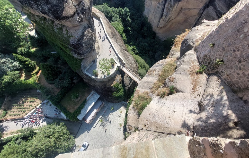 There are around 150 steps to the main entrance of Varlaam Monastery after you trot over a bridge from a neighbouring column. You are rewarded with spectacular views of course and a small church adorned with frescos from the 16th century.