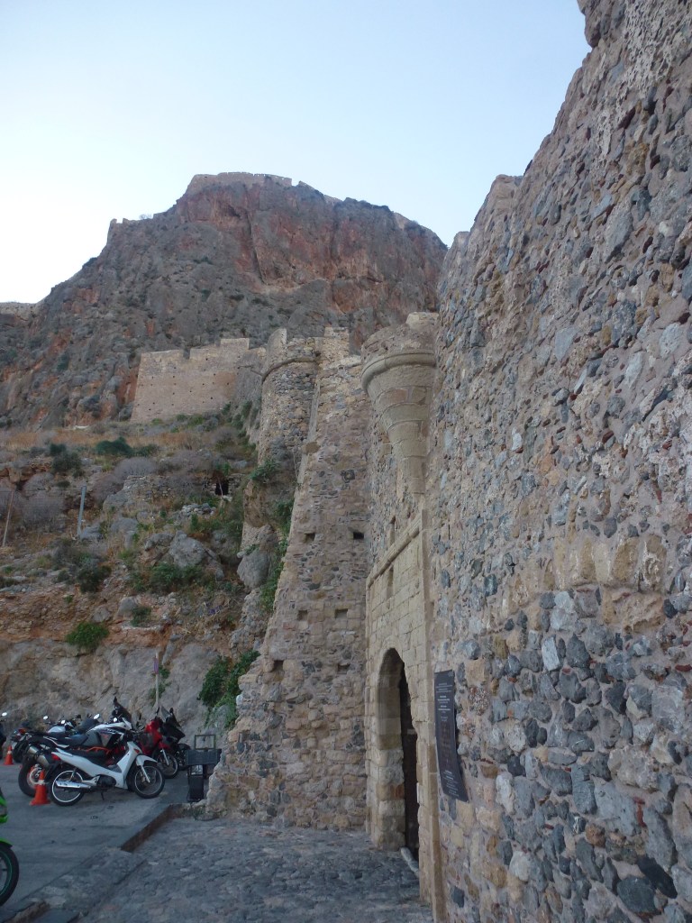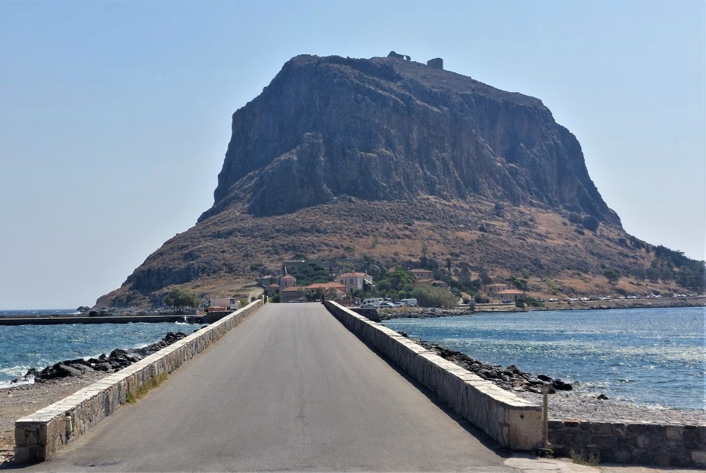 Monemvasia is joined to the modern town of Gefyra on the mainland by a causeway. You can drive along the causeway to the rock but parking is limited and cars are not able to enter the town itself. It may be a better option to park by the harbour for free and take and take the pleasant stroll along the causeway which takes about 20 minutes. There are a couple of disabled parking bays by the entrance to the town but Monevasia is not ideal for anyone with a walking disability.