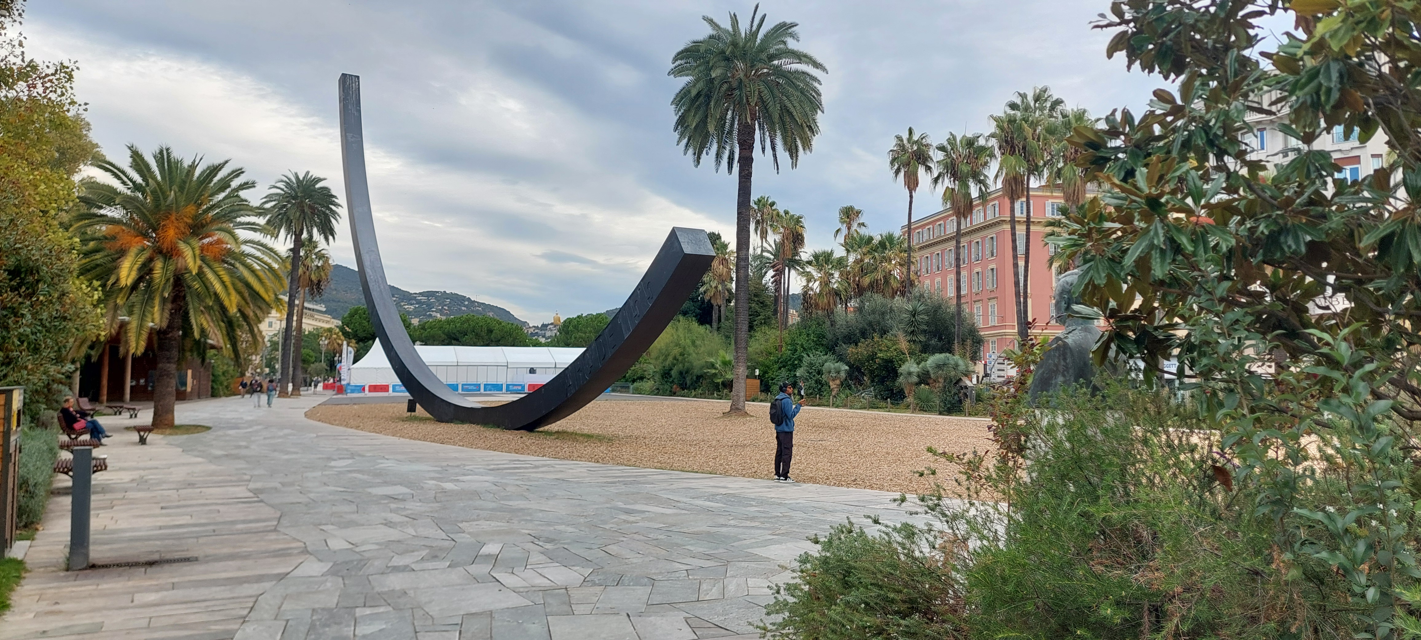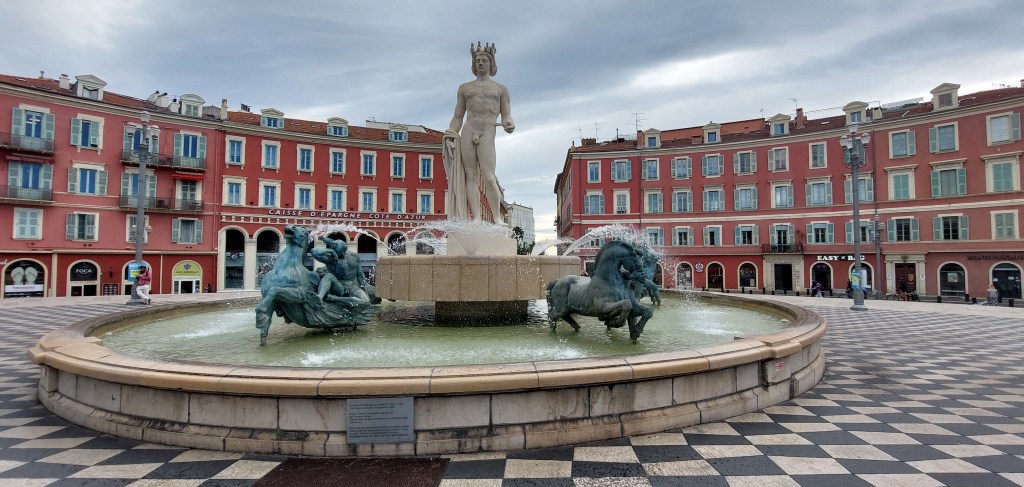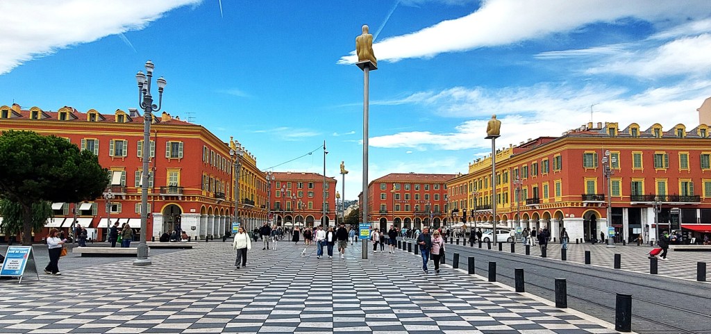 This elegant square is just outside of the Old Town and was established in the 1840’s. The view north towards Avenue Jean Médecin has seven figures atop of metal poles which were designed by the Spanish artist Jaumne Plensa and installed in 2007. To the south is the Fontaine du Soleil with the Greek God Apollo at the centre which caused controversy when it was originally unveiled in the 1950’s. The full story is here, [read it, it’s funny!].