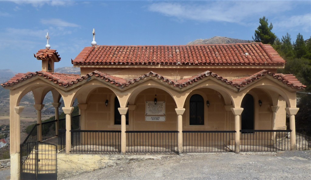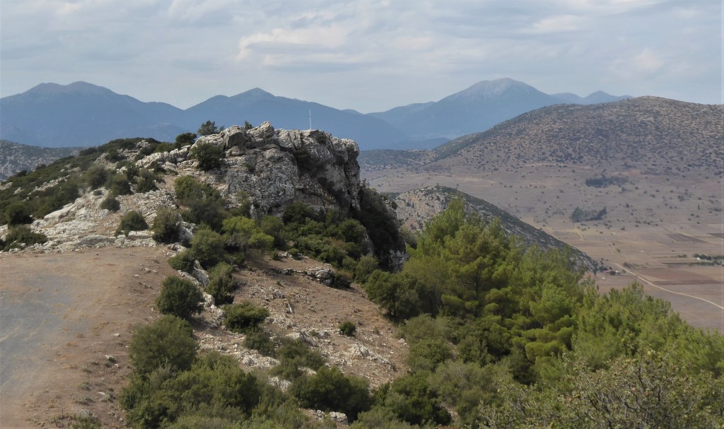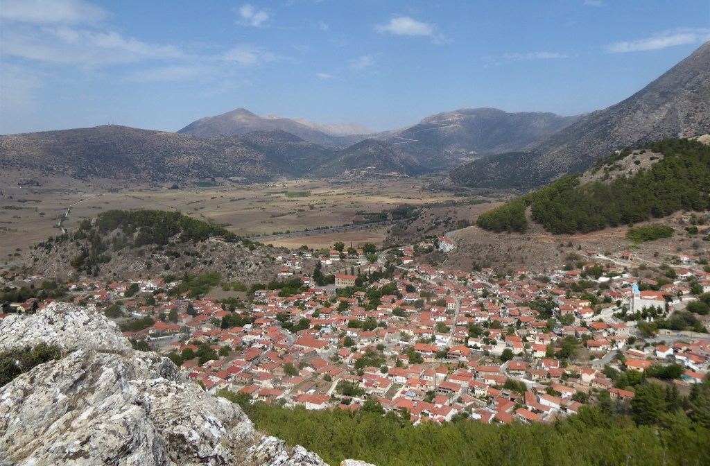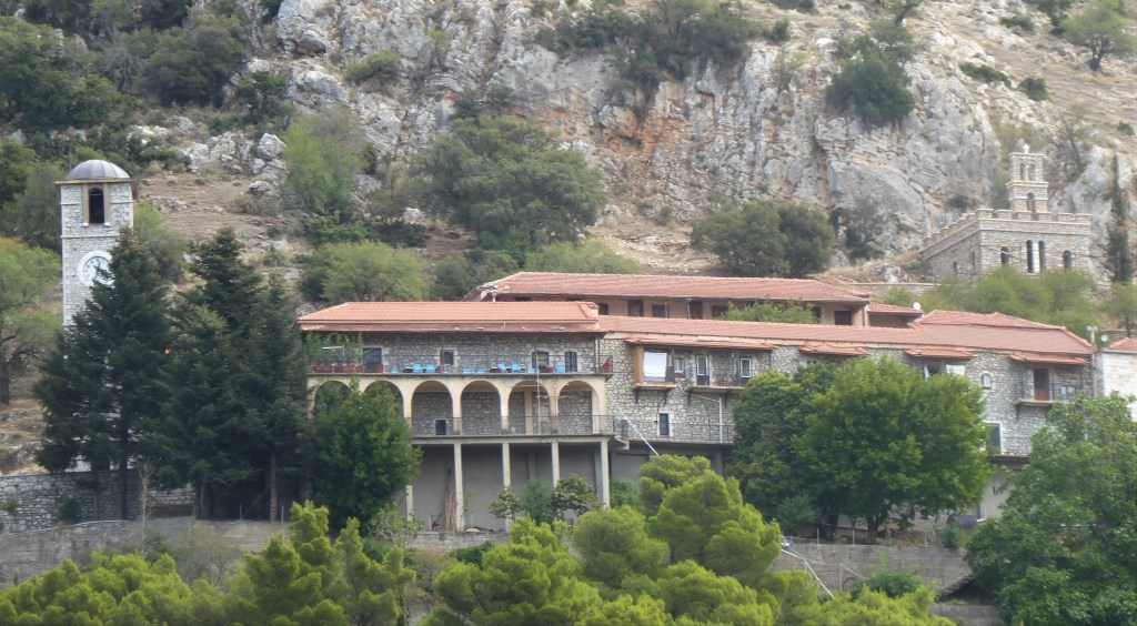 Nestani is signposted from the motorway. We did not hang around the town itself which had an impressive church but was otherwise unremarkable. We were looking to visit the monastery outside of the town and hoped for a nice place to have a picnic. We found a great spot opposite the monastery by a large white cross which had superb views of Nastani and the plain below.