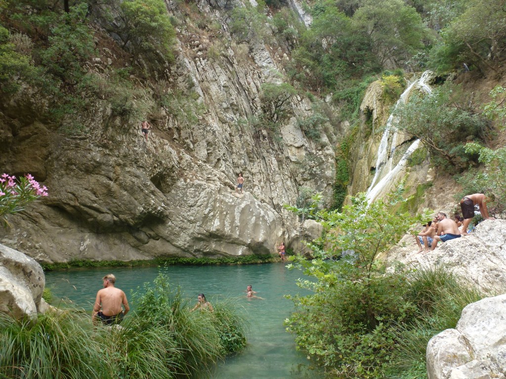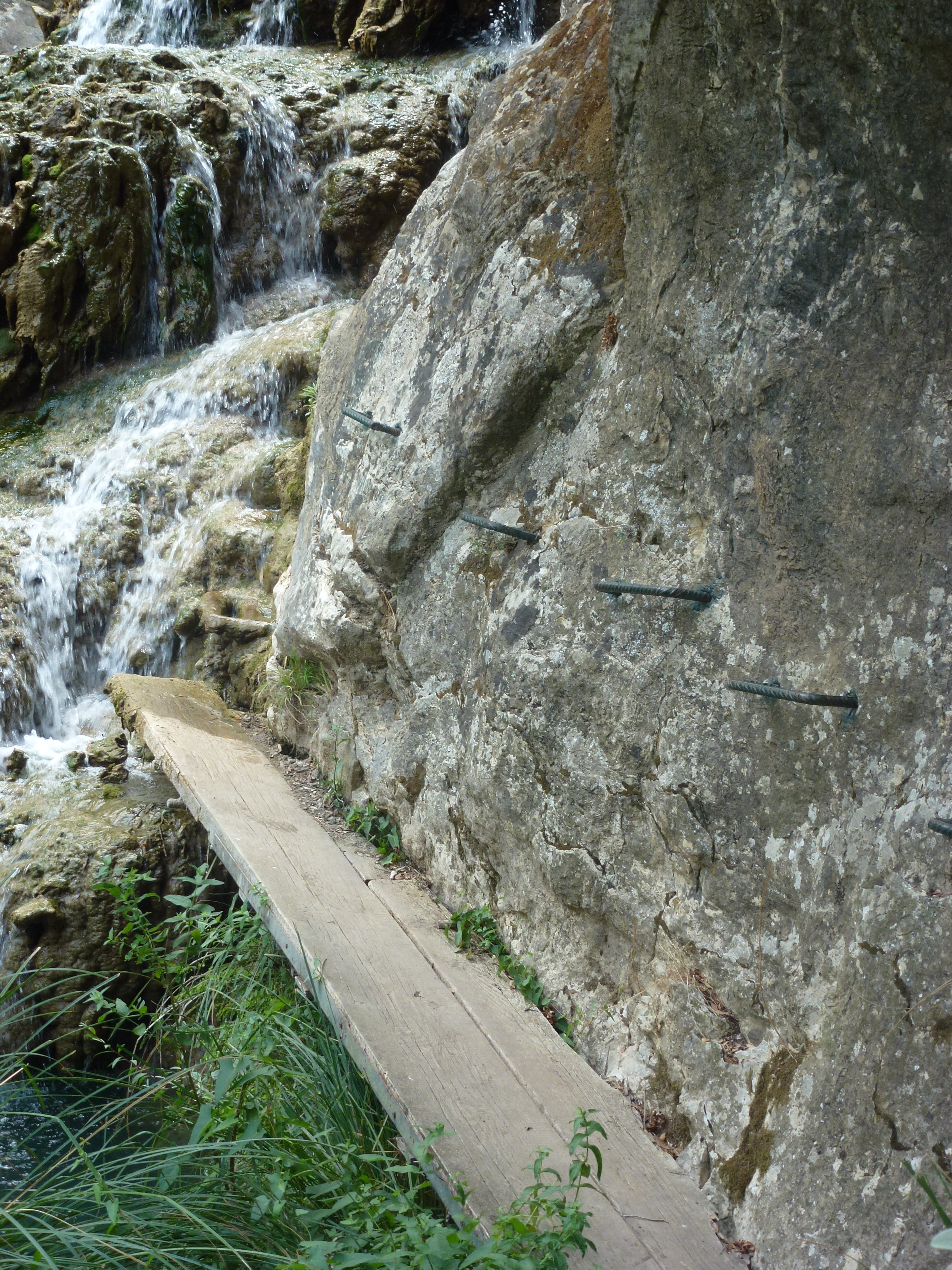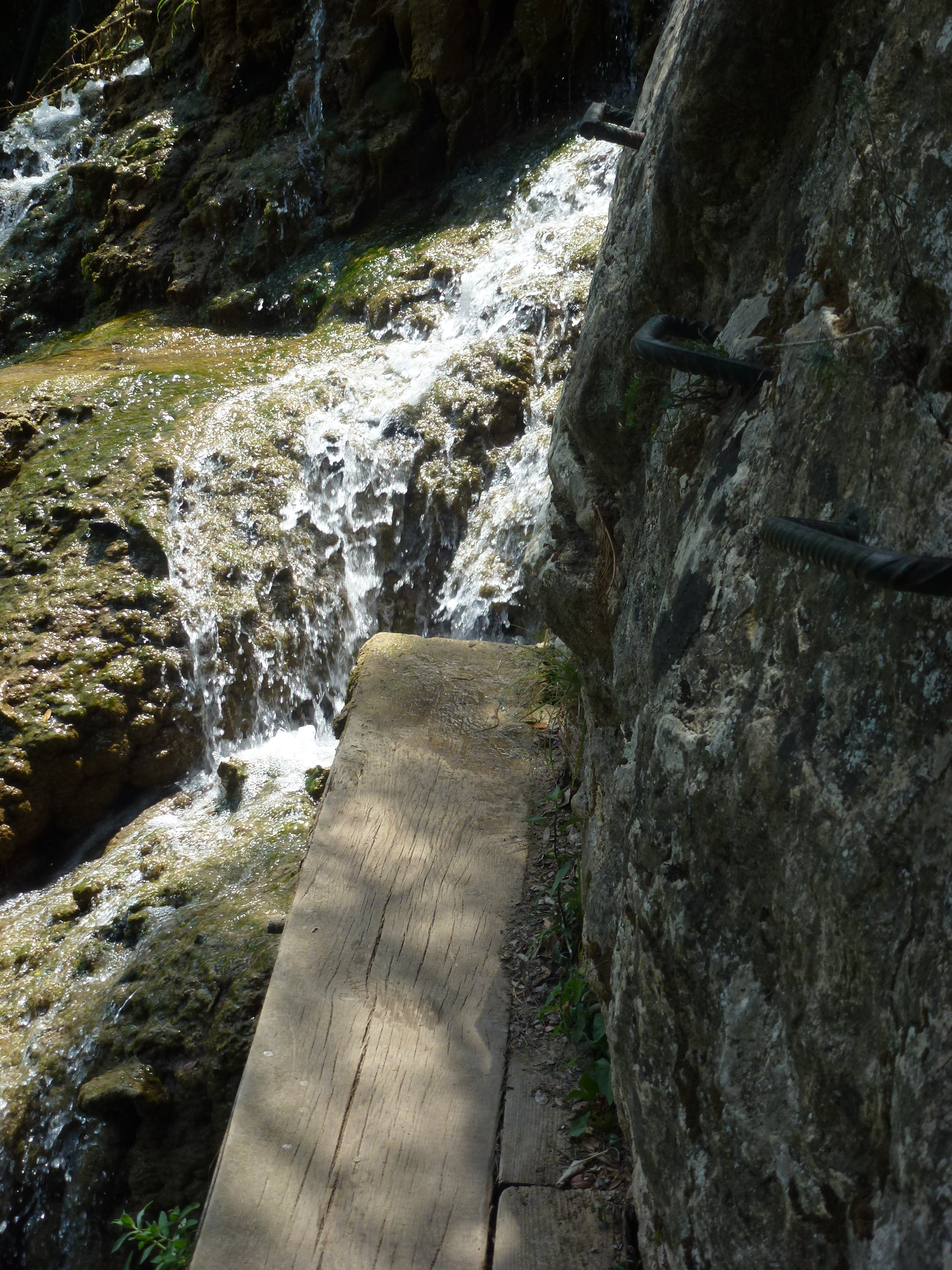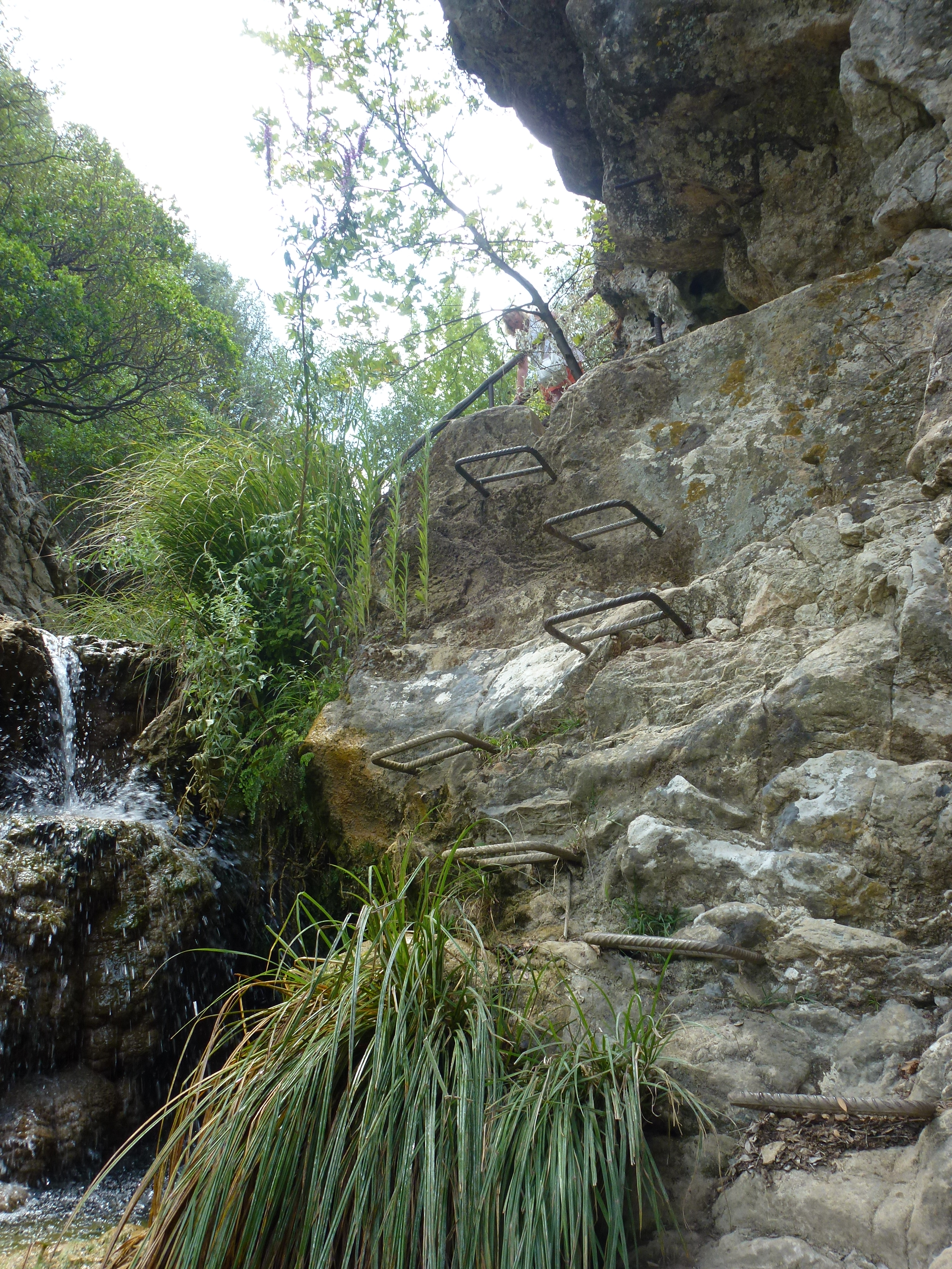 If you turn left at the wooded area the path follows the stream to a lake. Leashia flatly refused to go any further when the path degenerated into iron rungs and precarious planks nailed to a cliff! It makes sense to go this way first before heading back for a dip in the pool if you want to make the most of your visit.