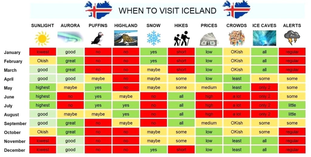 The summer is warmer, has long days and the midnight sun but this is when Reykjavik and major sights are at their busiest and prices are at a premium. The Mountain Roads [F roads] are also open at this time of year. The chart below is from the website EpicIceland and gives a handy overview but bear in mind it is a general guide only.