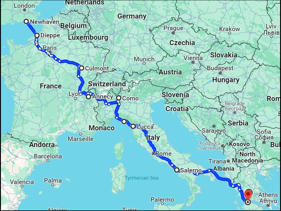 Stage 1 was to get the ferry from Newhaven to Dieppe and bomb through France fairly quickly, taking it slowly through Italy and heading down the western coast [this would take around two weeks]. We would then turn east to catch the ferry from Bari to Patras in the Peloponnese, Greece.