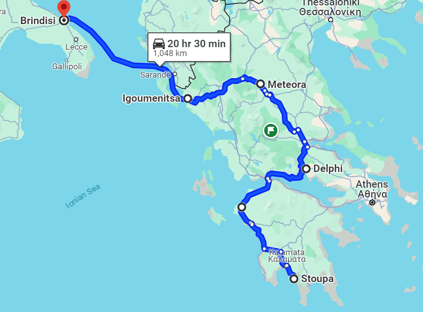 For the homeward journey we would head north via Delphi and Meteora in Greece and get the ferry from Igoumenitsa to Brindisi on the east coast of Italy.