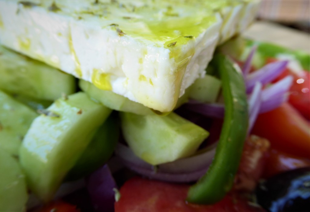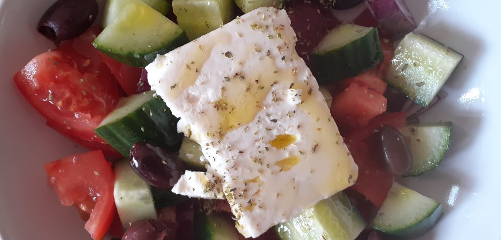 Ingredients: To feed one person- 1 ripe large [beefsteak] tomato, half a red onion, quarter of a large cucumber [roughly peeled if the skins are tough], some Kalamon [Kalamata] olives, slab of feta cheese, rigani [Greek oregano], a glug of extra virgin Greek olive oil and a splash of white wine vinegar. All the ingredients can be adjusted according to your preference. Just double the quantities if you want to cater for 2 people.