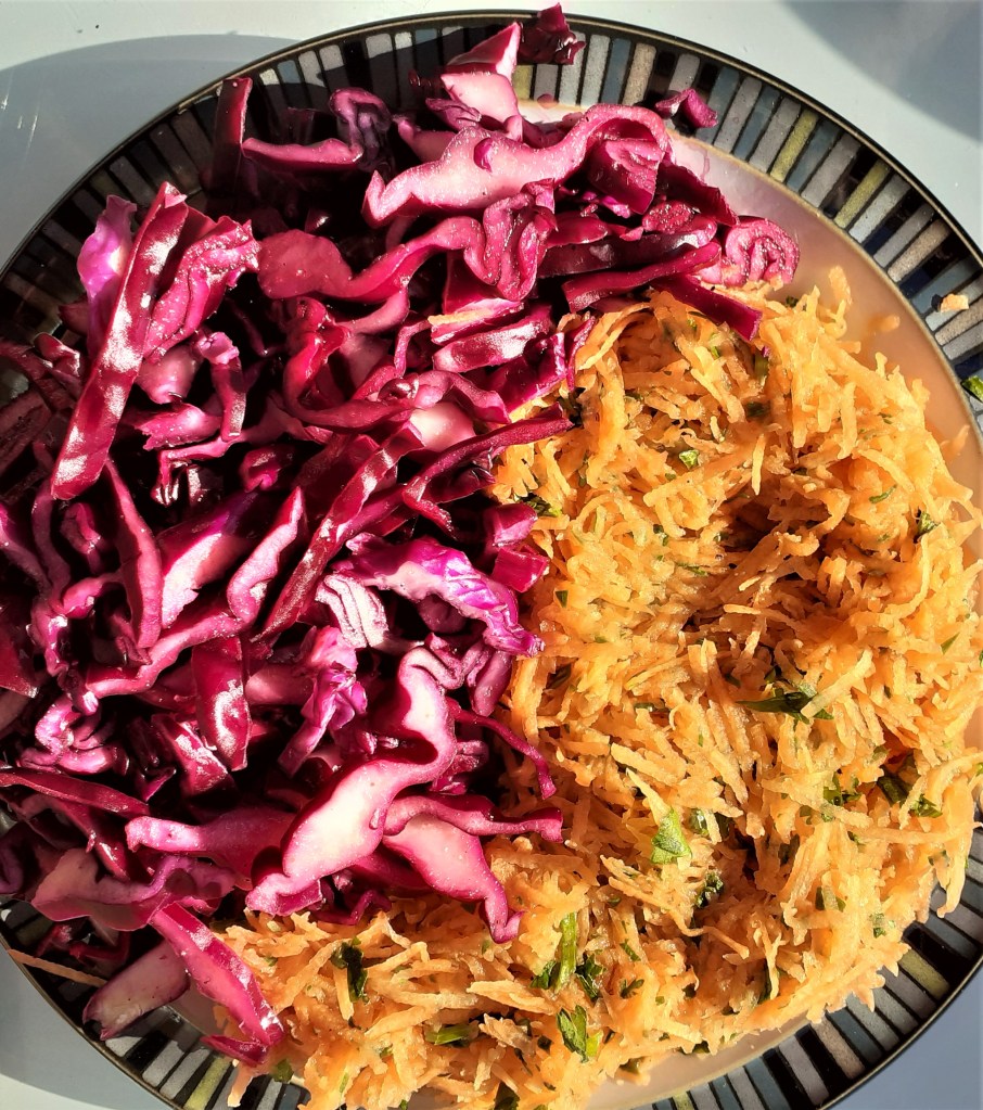 Ingredients: Carrot salad- Grated carrot. Lemon or lime juice, fresh finely chopped coriander or parsely, salt and pepper.