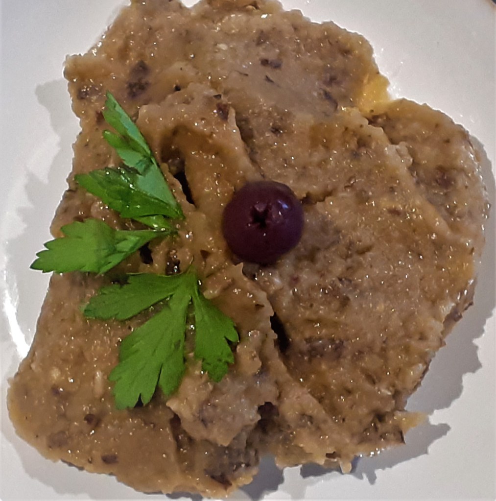 Ingredients: One chubby aubergine [and for our American friends- aubergine!]. a small onion, a few cloves of garlic, the juice of one lemon, salt and pepper to taste, a large dash or two of Greek olive oil. An olive and parsley leaf for decoration.