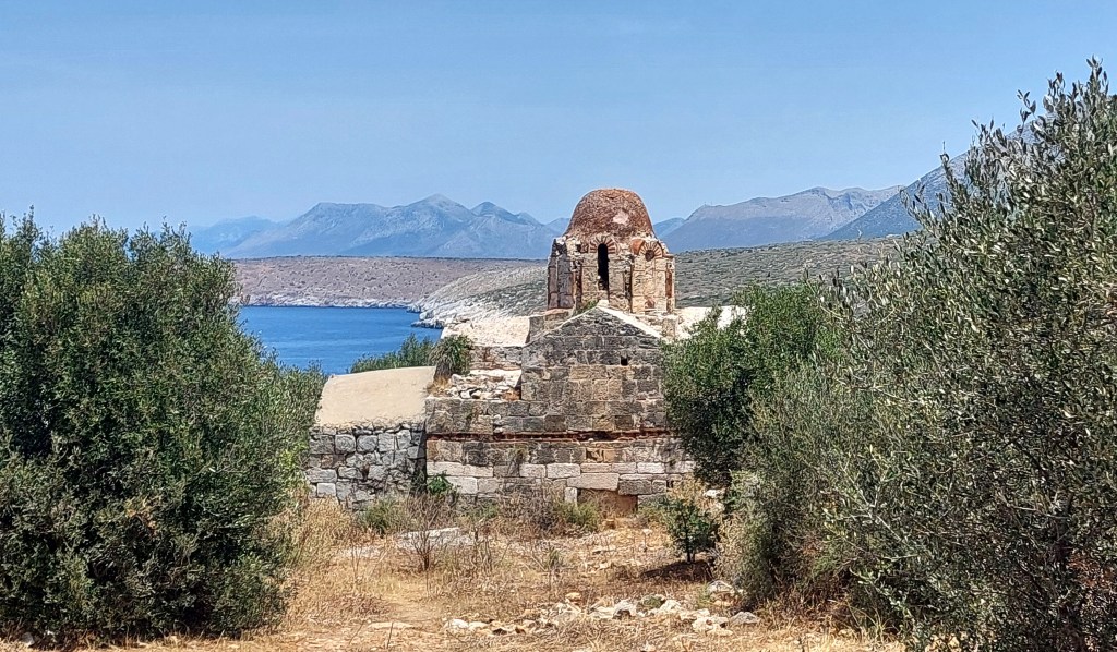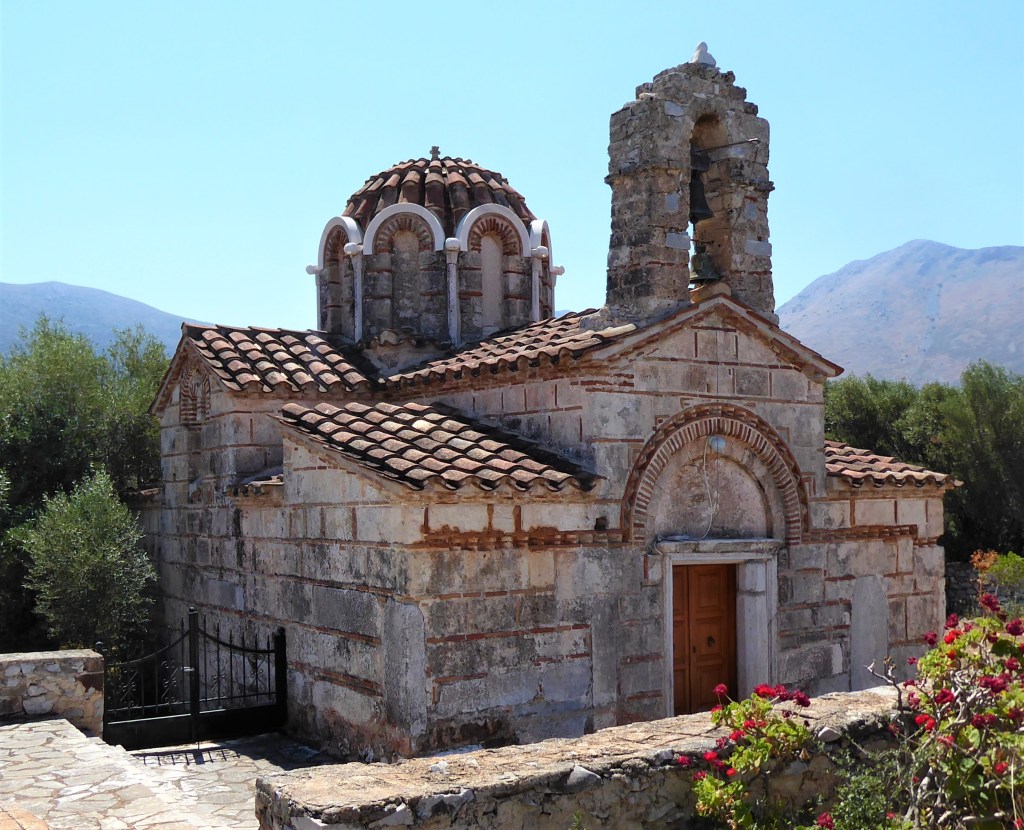 Vlacherna is a 12th century church near Mezapos. It is is lovely but watch out for the huge spiders and their webs strewn across the path. [Remember Shelob!].