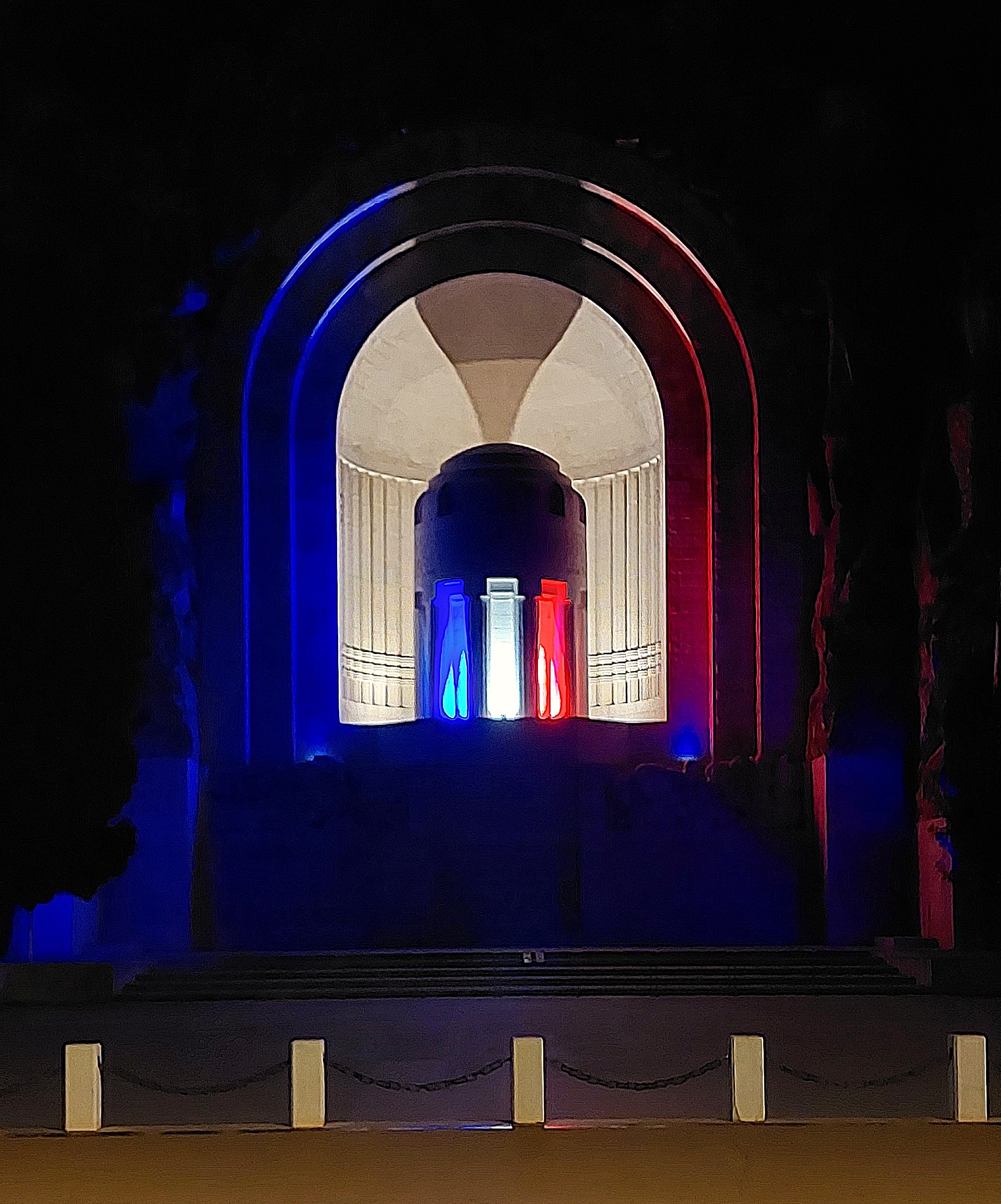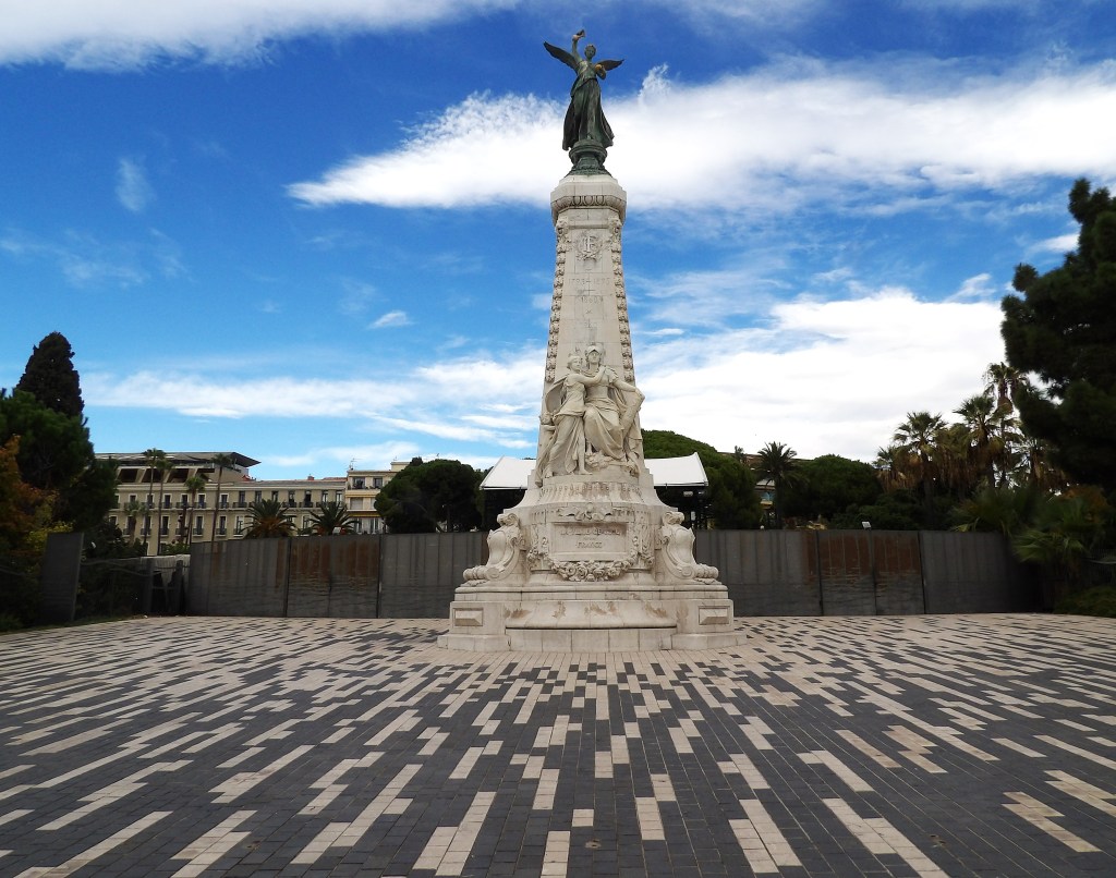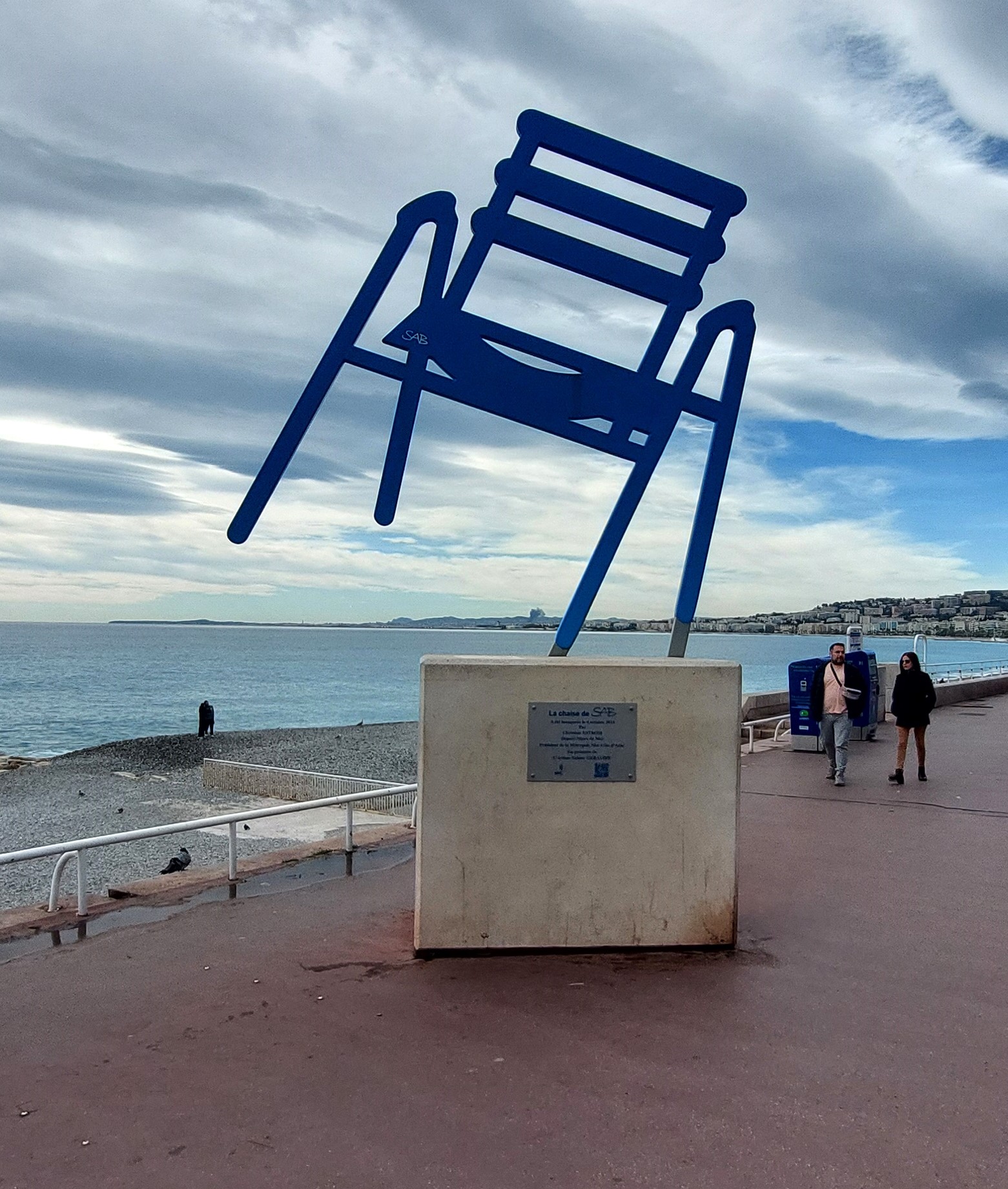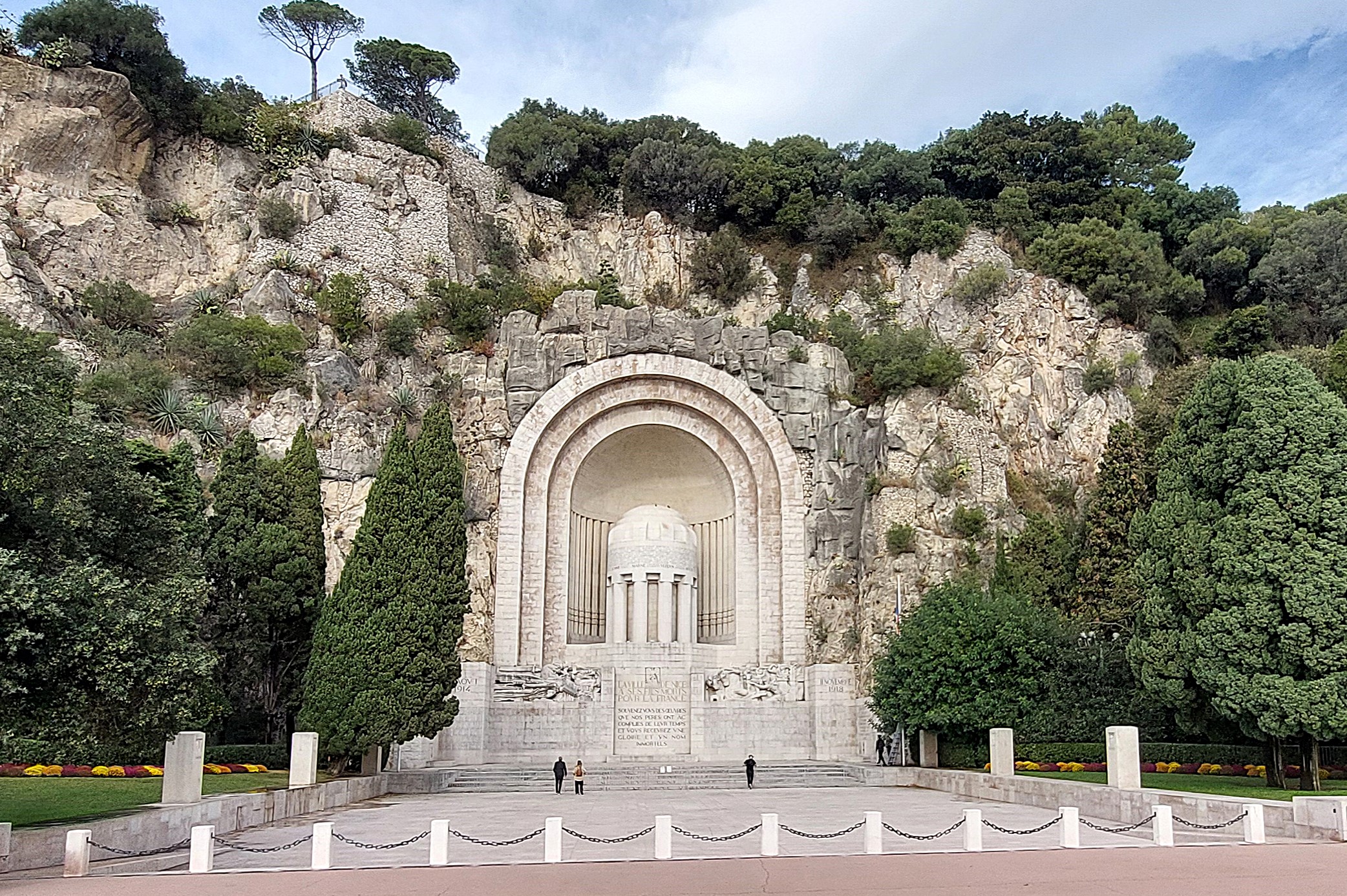 We did enjoy the seemingly 3D large blue chair which is in fact 2D- completely flat, [see photo below]. A blue armchair is a popular iconic symbol of Nice, symbolising relaxation and the Mediterranean lifestyle. La Chaise Bleue pictured above was created in 2014 by the artist Sabine Géraudie. There are other blue chairs positioned along the walk, some you can actually sit on. Another impressive monument is the Monument du Centenaire in Nice which is just over the road in front of the Jardin Albert 1er. It marks the 100th anniversary of the reunification of Nice and surrounding area with France in 1860.