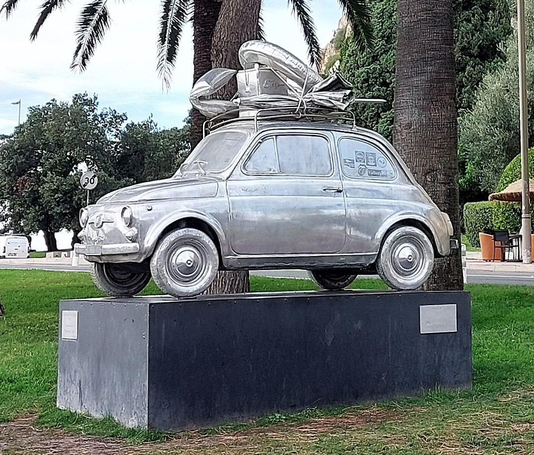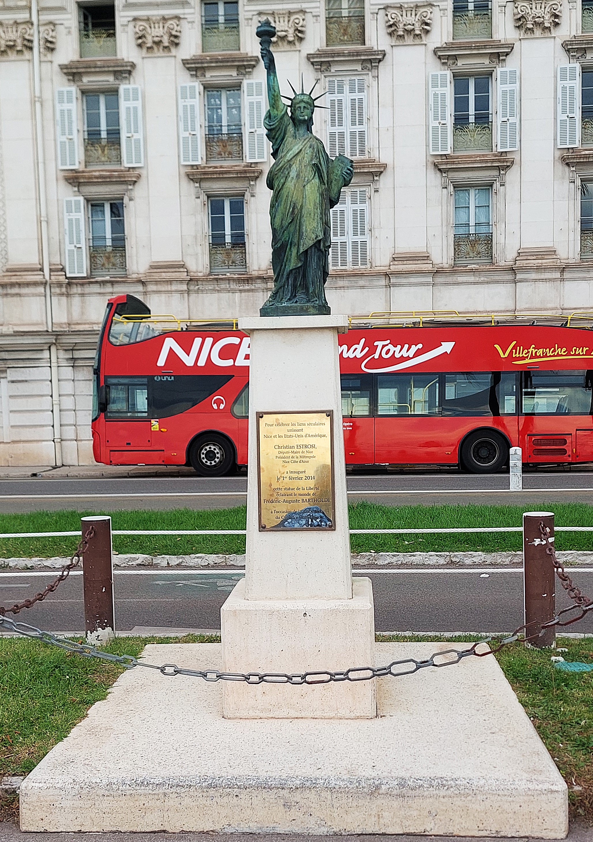 The Statue of Liberty was unveiled in 2014 to celebrate Franco- American friendship as well to commemorate the 100th Anniversary of WW1. The bizarre silver Fiat 500 is called un Dimanche à Nice and was created by Stéphane Cipre in 2019. The large metal sculpture is called Neuf Lignes Obliques and was created by Bernar Venet in 2010 to commemorate the 150th anniversary of the annexation of Nice by France.