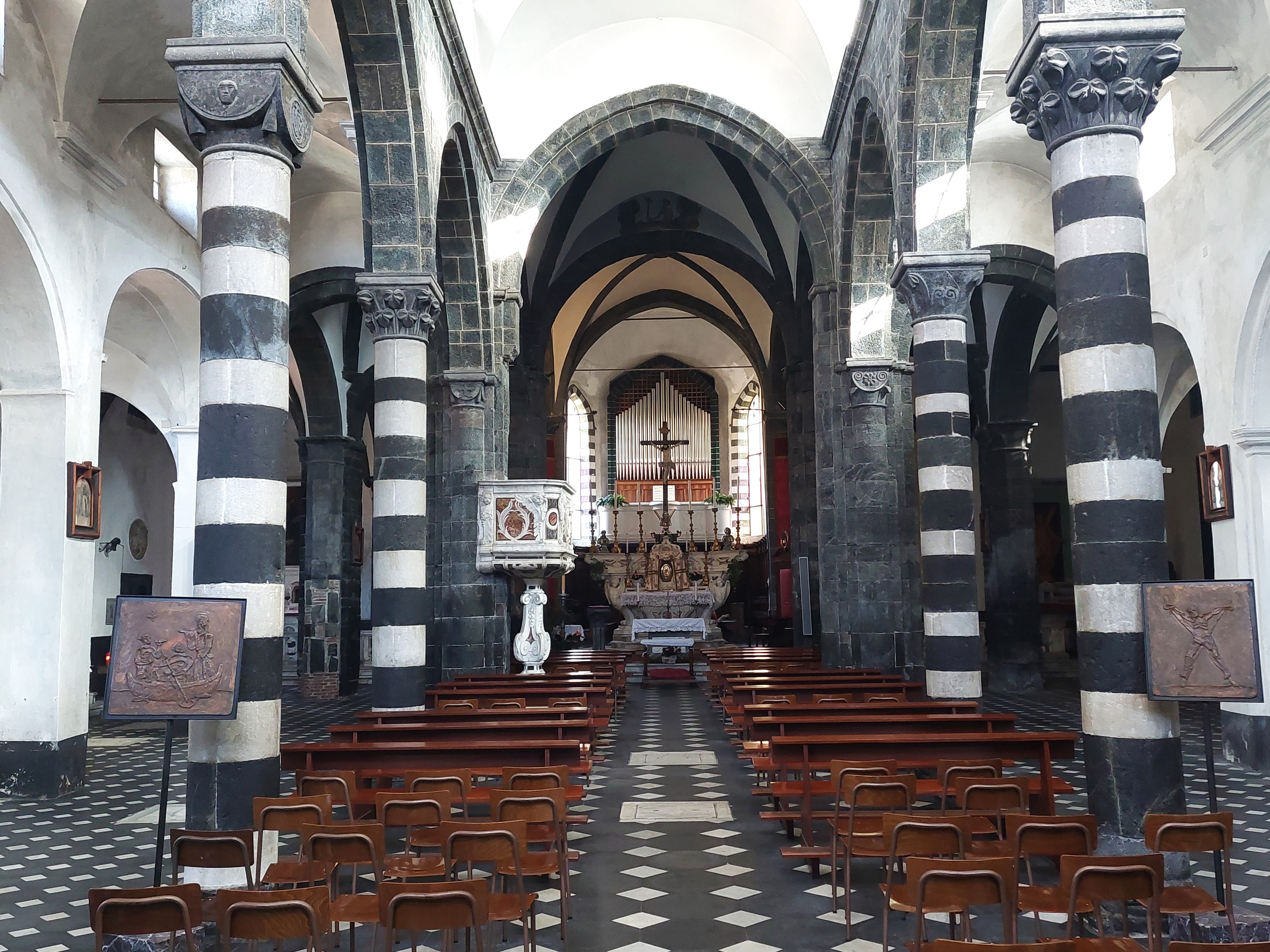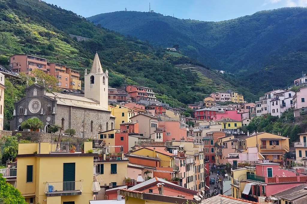 Riomaggiore is squeezed into a steep narrow valley which means the narrow streets do get crowded and like most of the villages in Cinque Terre there are lots of steps. There is a tunnel to the main street from the station and lots of narrow passageways to explore. If you fancy a gentle walk you should consider Via Dell’Amore, a 1km coastal path to Manarola, although it does incur a cost. There are plenty of places to grab something to eat too. There are a couple of fine churches including the imposing San Giovanni Battista [see below, right]. Next, we headed for Manarola where we had lunch.