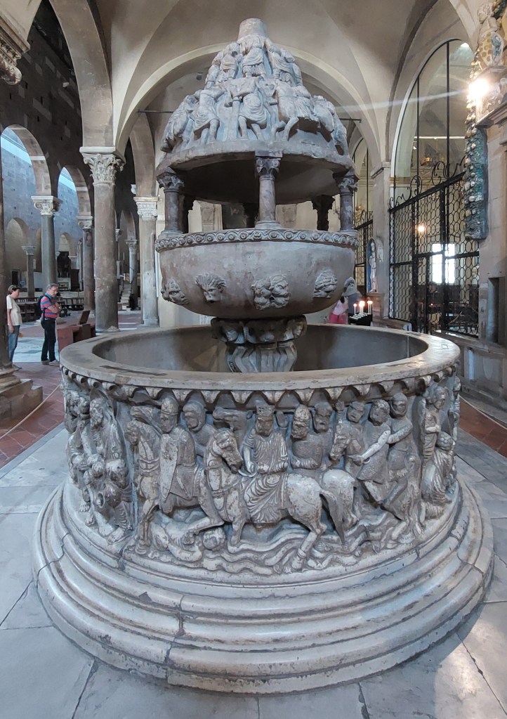 The 12th century Church of San Frediano [see above] on the Piazza was worth the small charge to see the exquisite carvings and ceiling detail, an enormous 12th century bapstism font and the slightly gruesome incorrupt body of St Zita who died in 1272. After our visit we were more than ready to indulge an Aperol and Hugo Spritz in one of the bars in the Piazza outside of San Frediano.