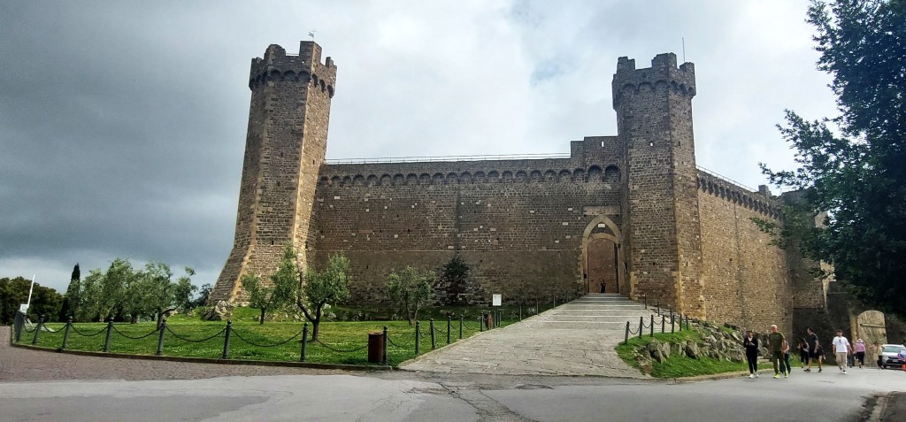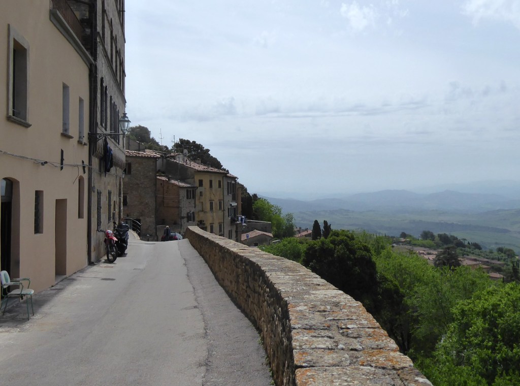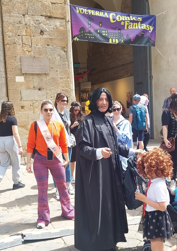 Soon after breakfast we left Lucca for the hills of Tuscany and the towns/villages of Volterra, San Gimignano, Montalcino and on to Montepulciano where we were staying for the night. Driving on the country roads avoiding the tolls made a pleasant change. Our first stop was the walled town of Volterra. It was extra busy due to a Comics and Fantasy festival being in full swing in the medieval square Palazzo dei Priori which meant there were people milling around in fancy dress, stalls and entertainment. The square is flanked by the 13th century town hall and 12th century Duomo.