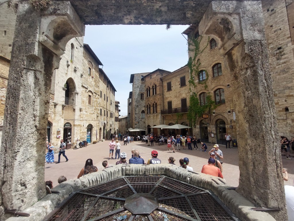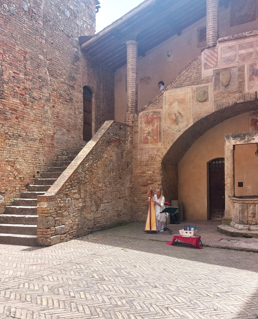 It was a short drive to San Gimignano, another medieval hill town. There was a festival here too and we had to queue to park. It was worth the wait though as the town is delighful and has three stunning piazzas, towers and medieval buildings in abundance. The 14th century Palazzo Communale [Town Hall] is known for its frescos and also its 54m high tower.