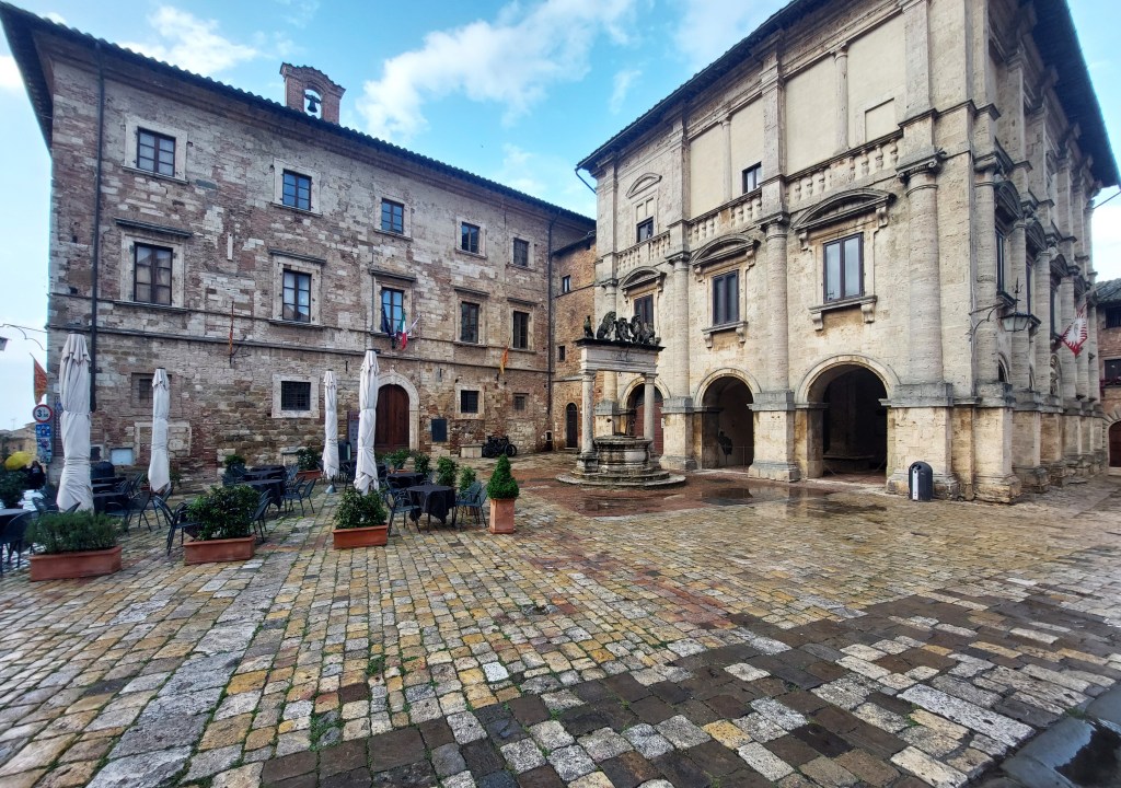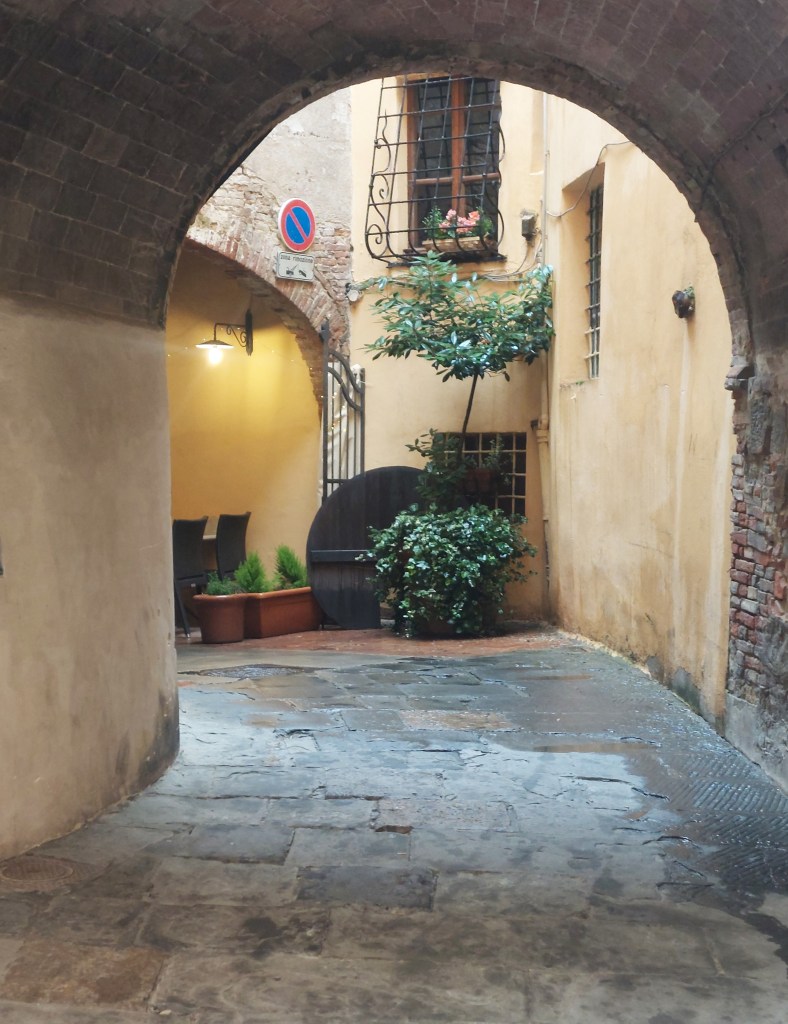 We departed Montalcino and arrived in Montepulciano around 5pm as it started to drizzle. The rain did not hamper our spirits though as Montepulciano was delightful and seemingly devoid of people and it was so quiet. We entered by Porta al Prato, the lower gate and from then on it was all uphill.
