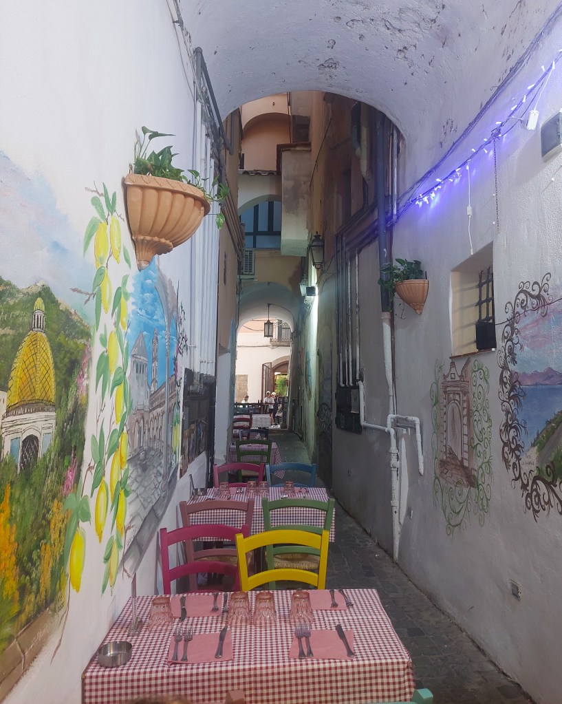 We checked in to our accommodation and headed straight to the port and bought ferry boat tickets for the next day. We then sauntered around Salerno. Salerno is a major port so there are ugly areas which are best avoided but the old town had narrow attractive streets and it did not strike us as very touristy or that busy in fact. The 11th century Duomo was stunning. [see photos above]. Many of the pillars in the Duomo had been nicked from Paestum, which we planned to visit in a couple of days time. It had been a long day and we were pretty knackered so we were glad to relax with a drink and dinner at Osteria dei Sapori situated in a narrow alley before heading back to our accommodation.