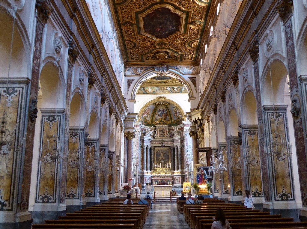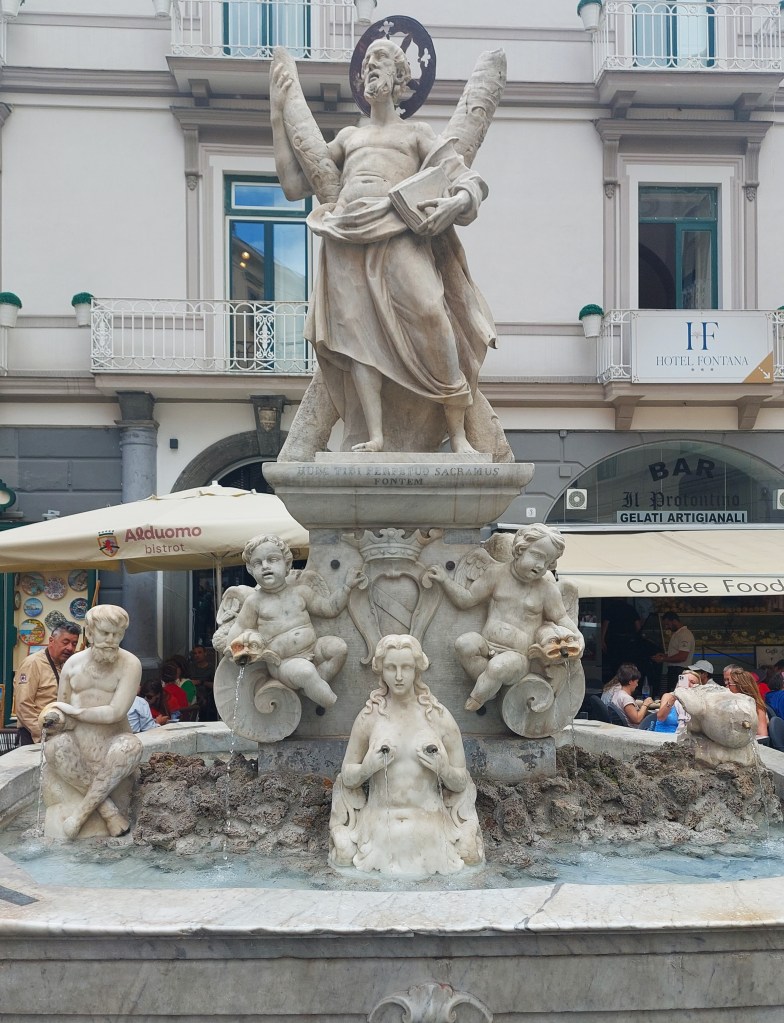 We did enjoy Amalfi despite the crowds. The Duomo which overlooks the Piazza was wonderful and the fountain in the square was a bit rudey featuring a lady with squirty bosoms. The Duomo, which dates from as early as the 9th century and has had many additions over the centuries, was sumptiously decorated on the inside with a striking cloister and an adjacent museum full of treasures.